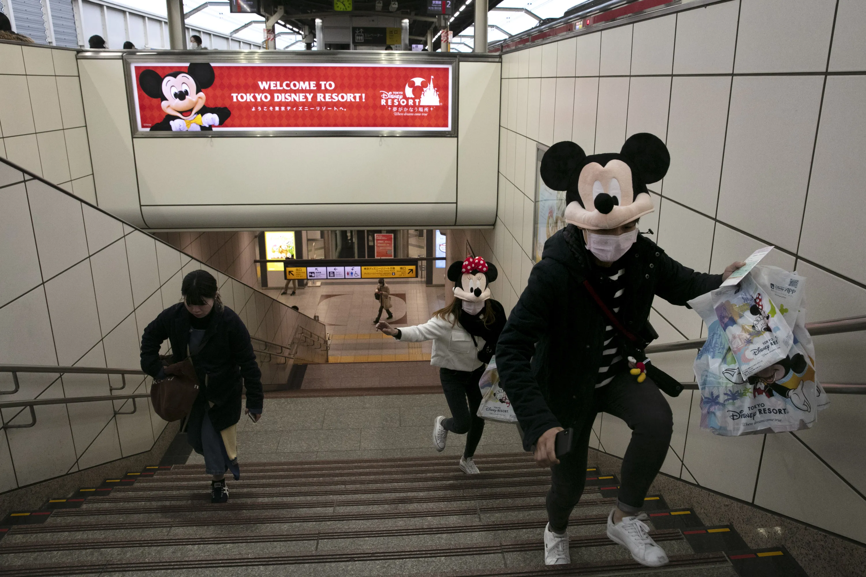 Two women rush to catch a train after visiting Tokyo Disneyland in Urayasu, near Tokyo, Friday, February 28, 2020. The amusement park will be closed from Saturday until March 15 in an effort to prevent the spread of COVID-19. (Photo by Jae C. Hong/AP Photo)