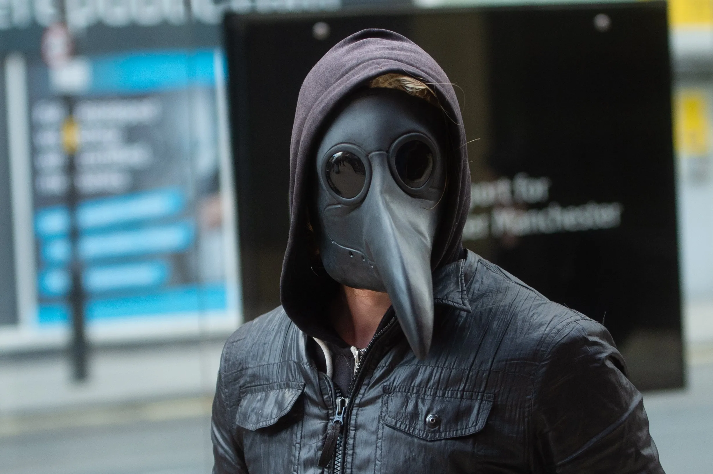 Shoppers and commuters in Manchester wearing face masks on February 28, 2020, including plague doctor masks due to the Coronavirus crisis in the UK. (Photo by Mario Forshow/Cavendish Press)