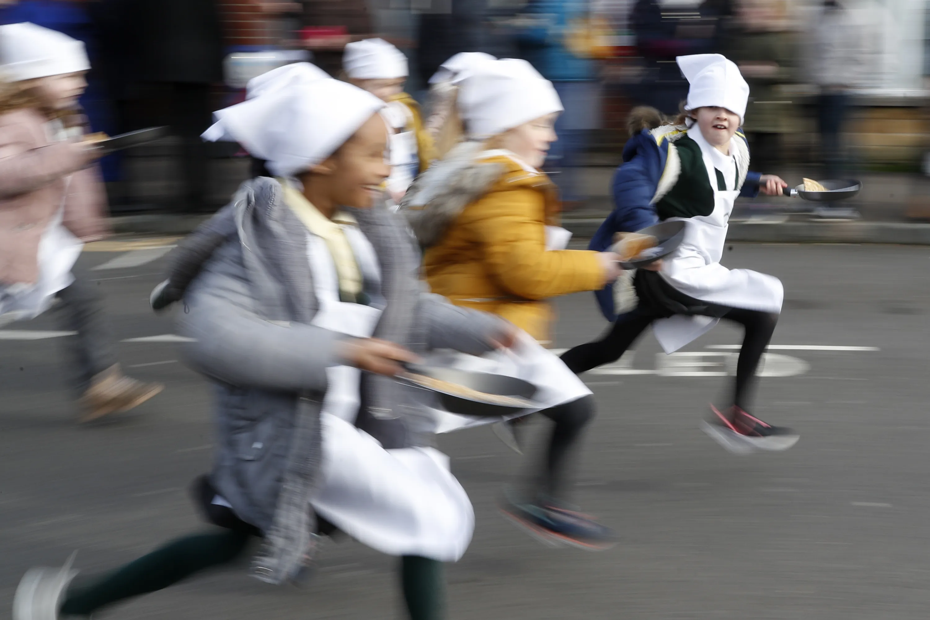 Schoolchildren from local schools take part in the children's races prior to the annual Pancake race in Olney, Buckinghamshire, England, Tuesday, February 25, 2020. Every year women clad in aprons and head scarves from Olney and the city of Liberal, in Kansas, USA, run their respective legs of the race with pancakes in their pans. According to legend, the Olney race started in 1445 when a harried housewife arrived at church on Shrove Tuesday still clutching her frying pan with a pancake in it. (Photo by Alastair Grant/AP Photo)