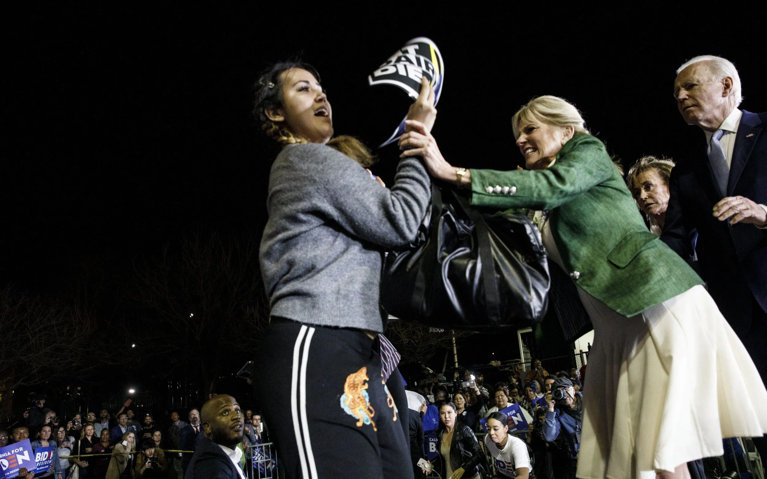 Former Vice President Joe Biden, 2020 Democratic presidential candidate, right, watches as his wife Jill Biden, center, blocks a protester from arriving on stage during an primary night rally in the Baldwin Hills neighborhood of Los Angeles, California, U.S., on Tuesday, March 3, 2020. The biggest day of the presidential primary calendar will define the nomination fight for Bernie Sanders and Biden and determine whether Michael Bloomberg and Elizabeth Warren have a rationale for carrying on their campaigns. (Photo by Patrick T. Fallon/Bloomberg via Getty Images)