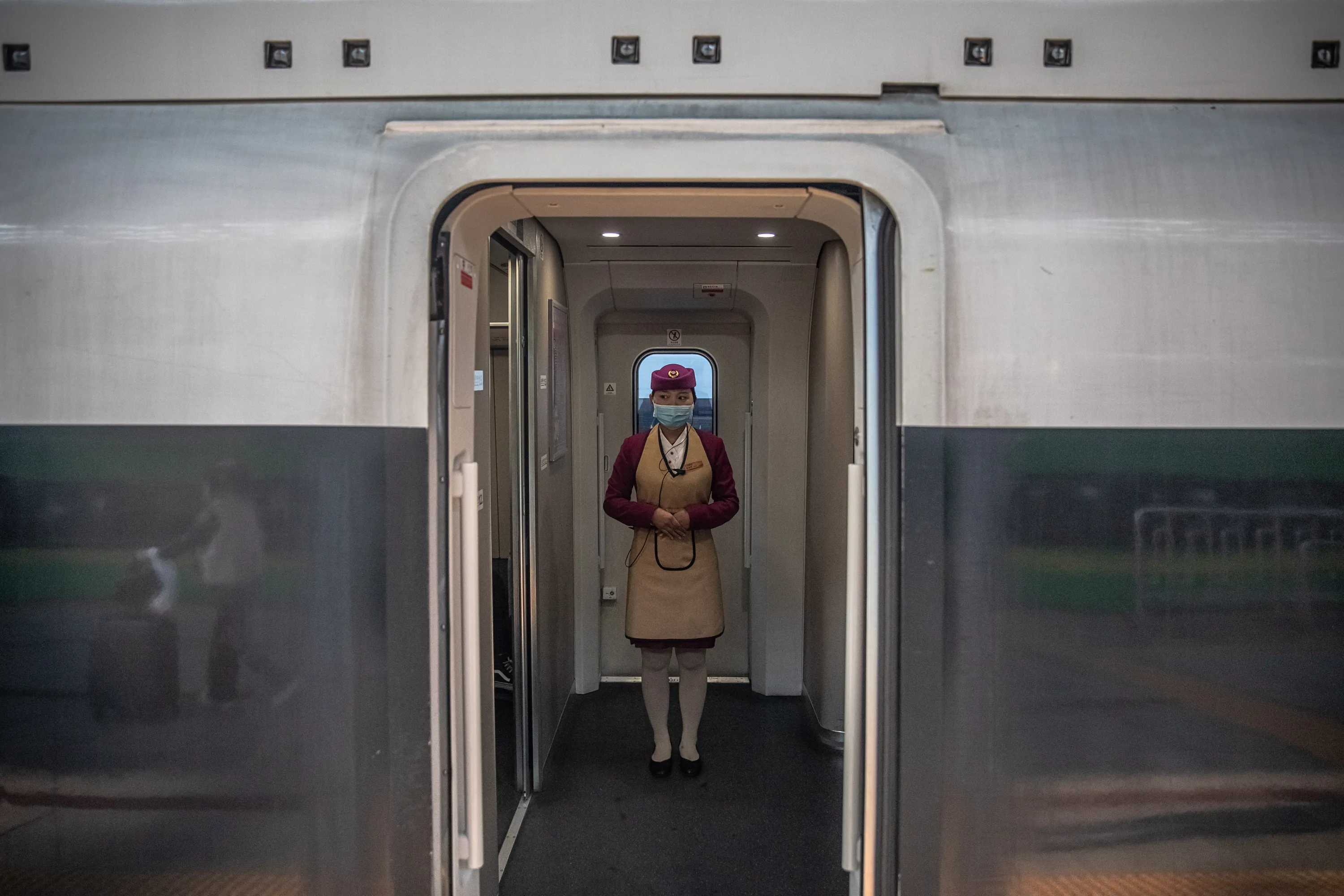 A train attendant wearing a protective face mask stands on a train to Wuhan, at the railway station in Beijing, China, 29 March 2020. Wuhan, the epicenter of the coronavirus outbreak, partly lifted the lockdown allowing people to enter the city after more than two months. Chinese authorities eased the quarantine measures as cases of Covid-19 across China have plummeted, according to Chinese government figures. (Photo by Roman Pilipey/EPA/EFE)