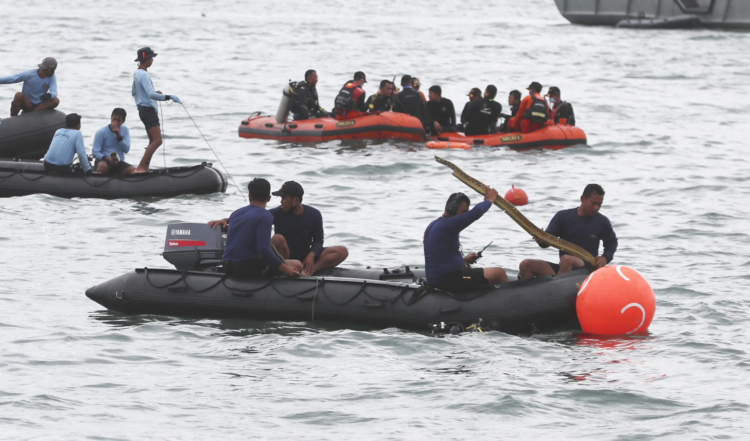 Rescuers carry debris found in the waters around the location where a Sriwijaya Air passenger jet has lost contact with air traffic controllers shortly after the takeoff, in Java Sea, near Jakarta, Indonesia, Sunday, January 10, 2021. Indonesian divers on Sunday located parts of the wreckage of a Boeing 737-500 in the Java Sea, a day after the aircraft with dozens of people onboard crashed shortly after takeoff from Jakarta. (Photo by Achmad Ibrahim/AP Photo)