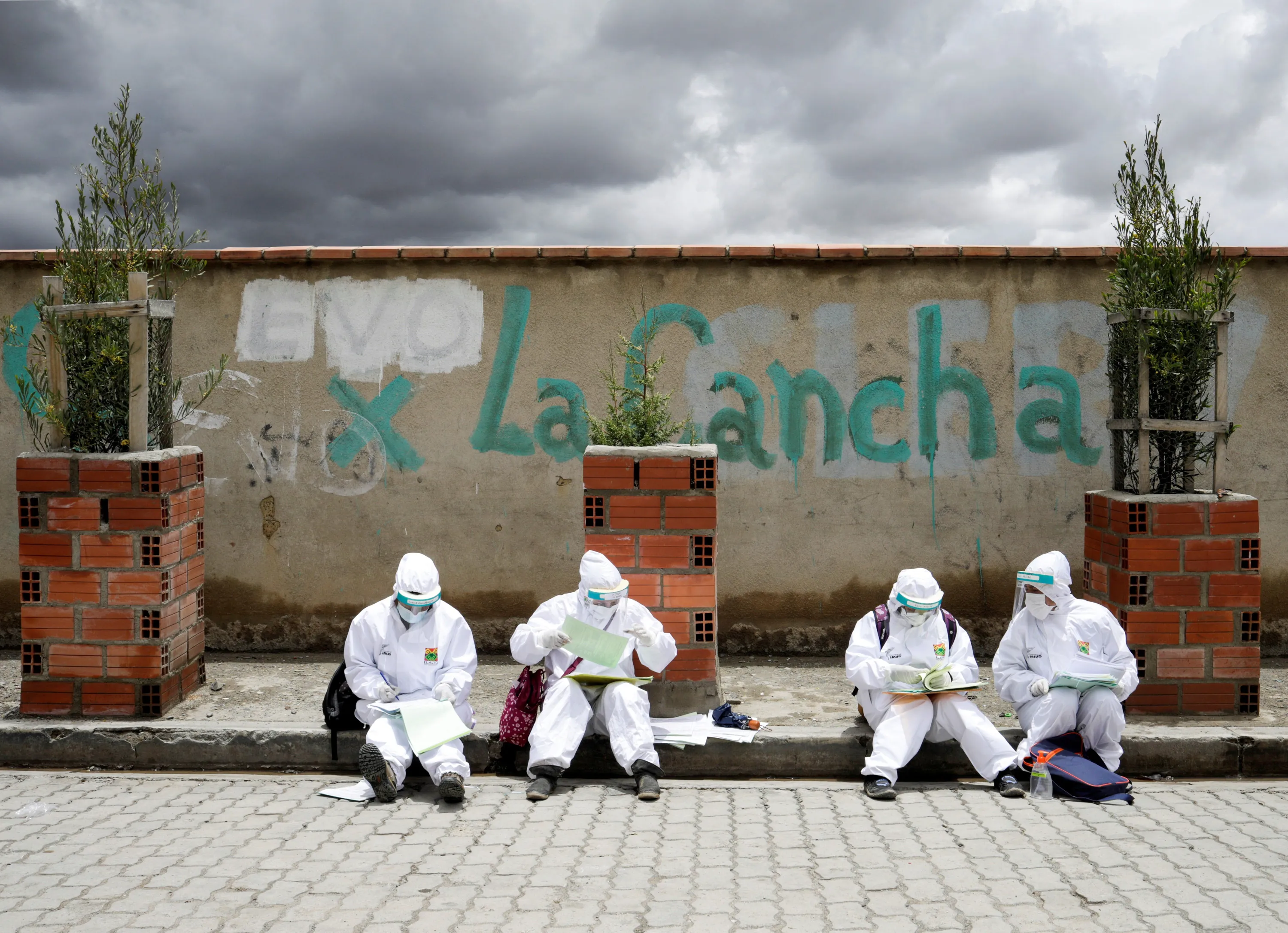 Health workers order their reports, amid the coronavirus disease (COVID-19) outbreak in El Alto, Bolivia on January 16, 2021. (Photo by David Mercado/Reuters)