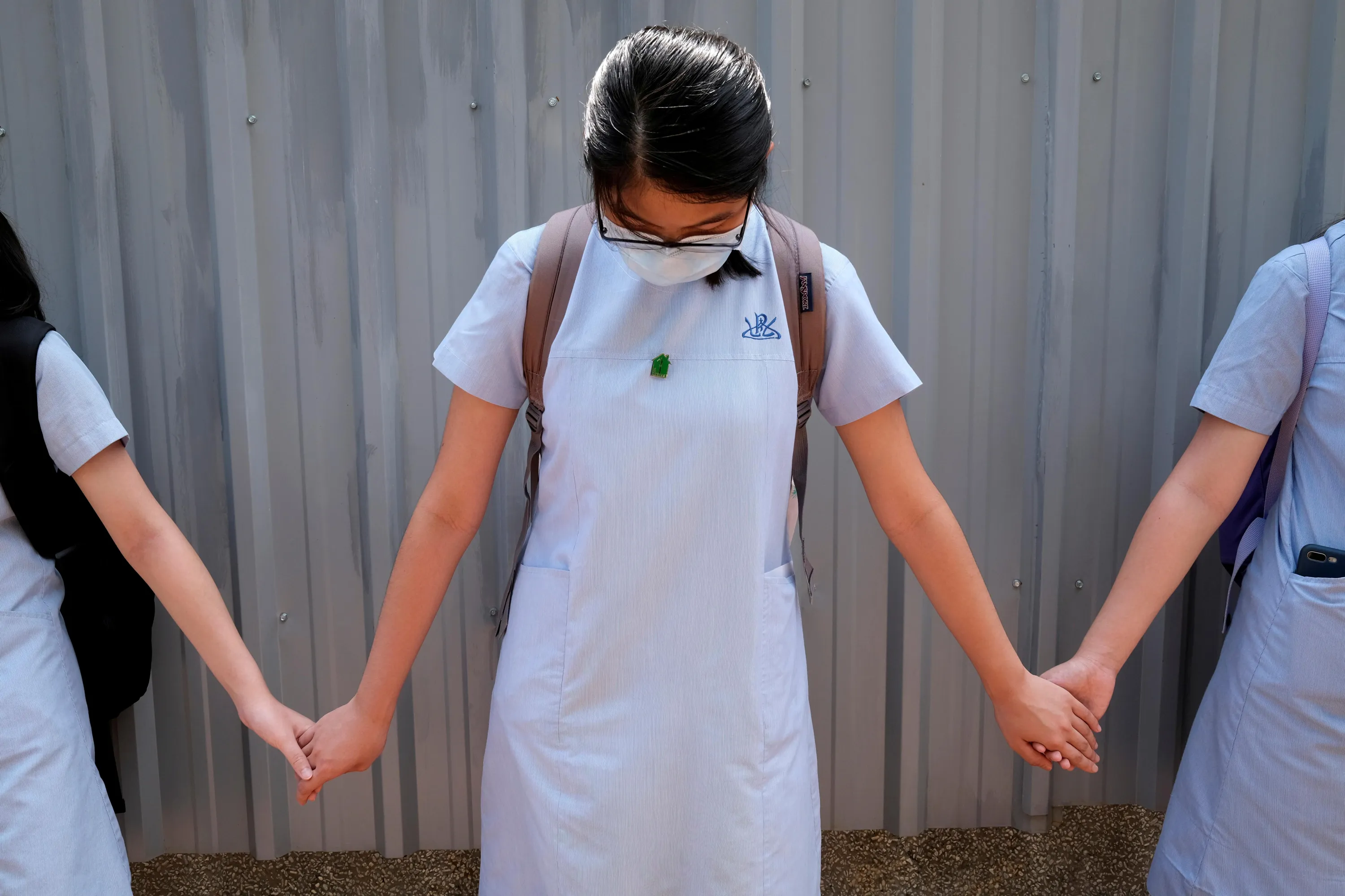 Secondary school students form a human chain near a school campus to protest against a teacher's release over “her political beliefs” as they said, in Hong Kong, China on June 12, 2020. (Photo by Tyrone Siu/Reuters)