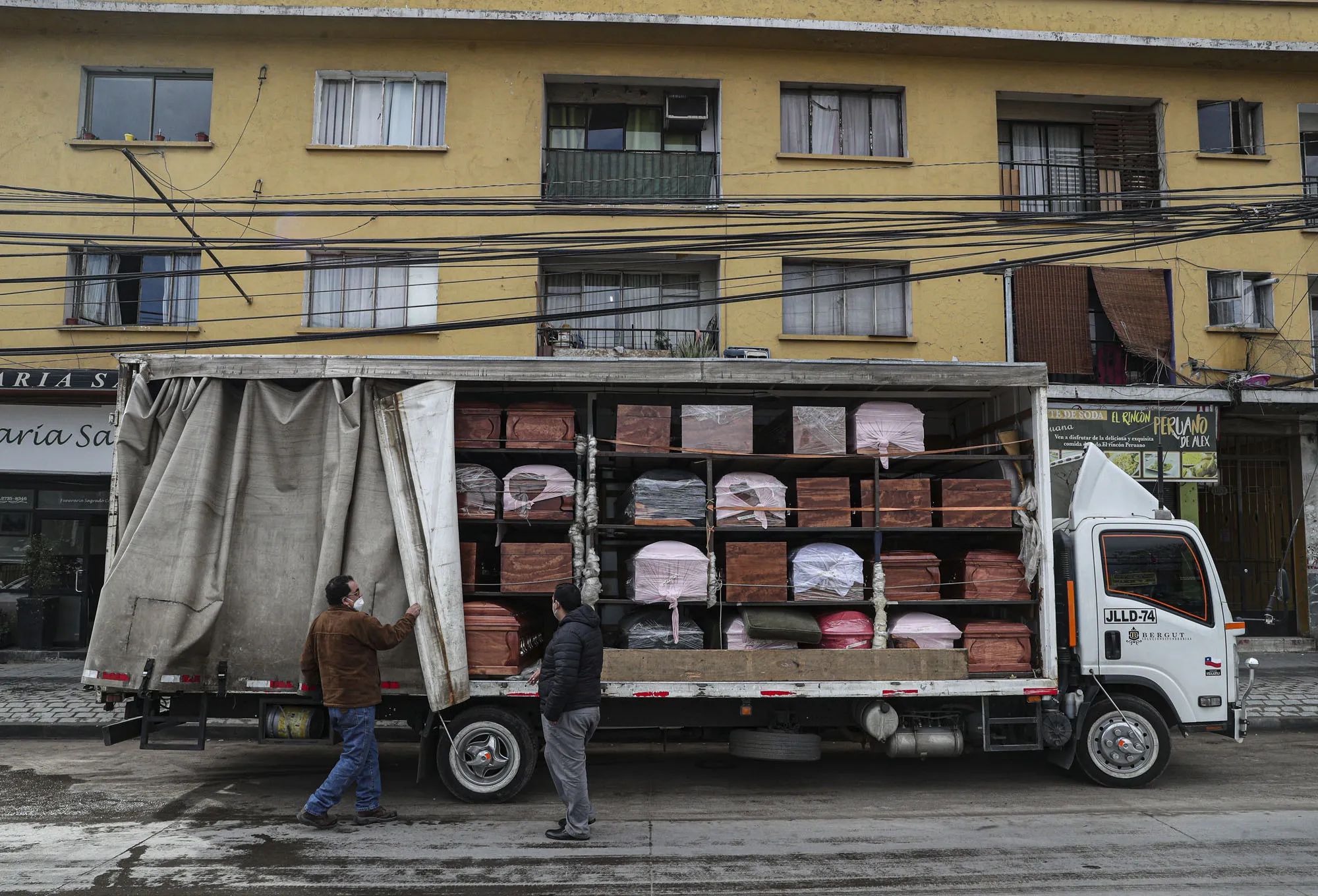 Bergut Funeral Services employees deliver coffins to a funeral store in Santiago, Chile, Friday, June 19, 2020. Coffin production has increased 120%, according to owner Nicolas Bergerie. A basic coffin penned the COVID model was designed to cope with the increase of deaths during the new coronavirus pandemic. (Photo by Esteban Felix/AP Photo)