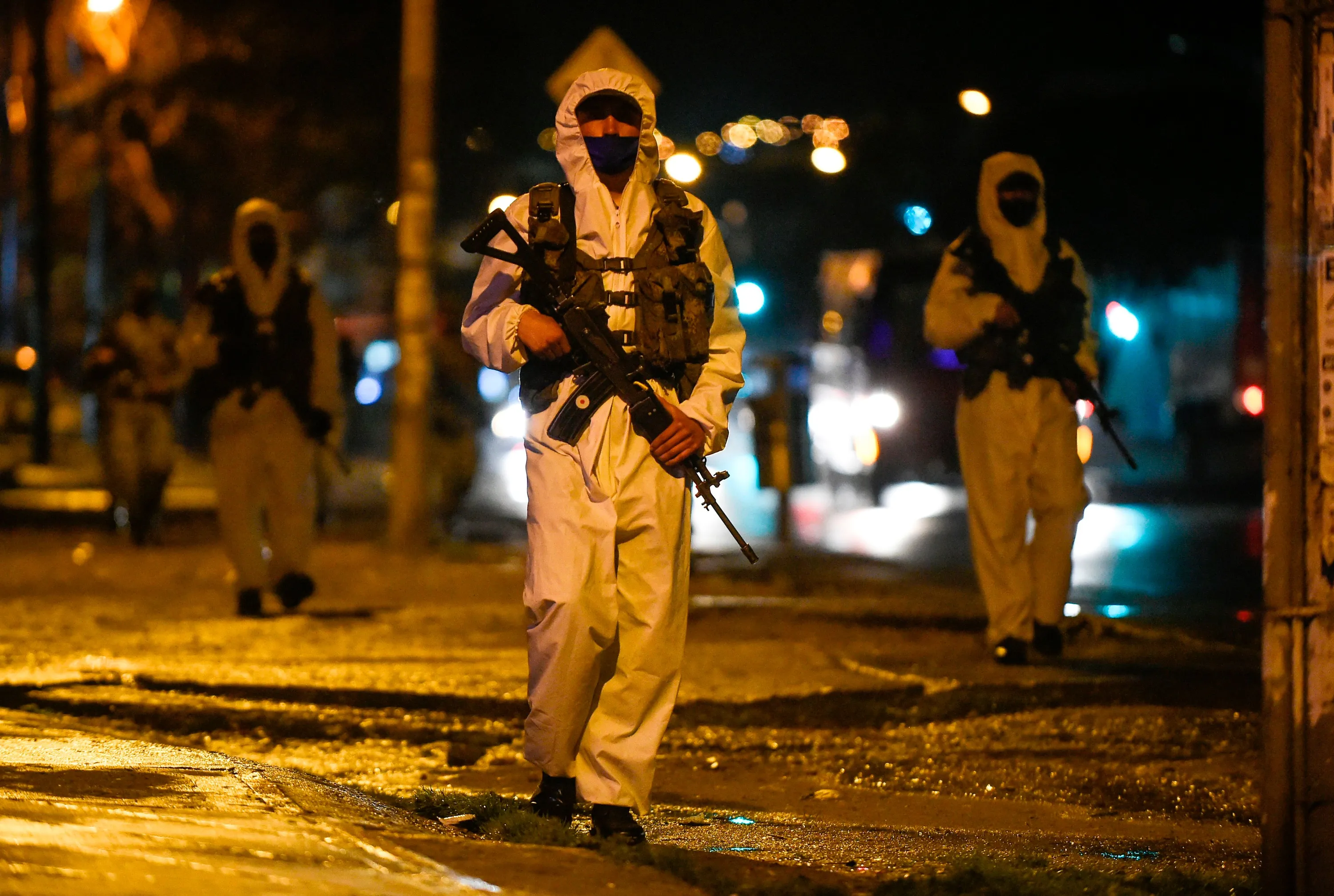 Colombian soldiers patrol the streets in Usme neighborhood, south Bogota, on July 15, 2020. Bogota on July 13 enforced a strict zonal lockdown, affecting 2.5 million people, to restrict movement for the next two weeks to contain new outbreaks of COVID-19. (Photo by Juan Barreto/AFP Photo)