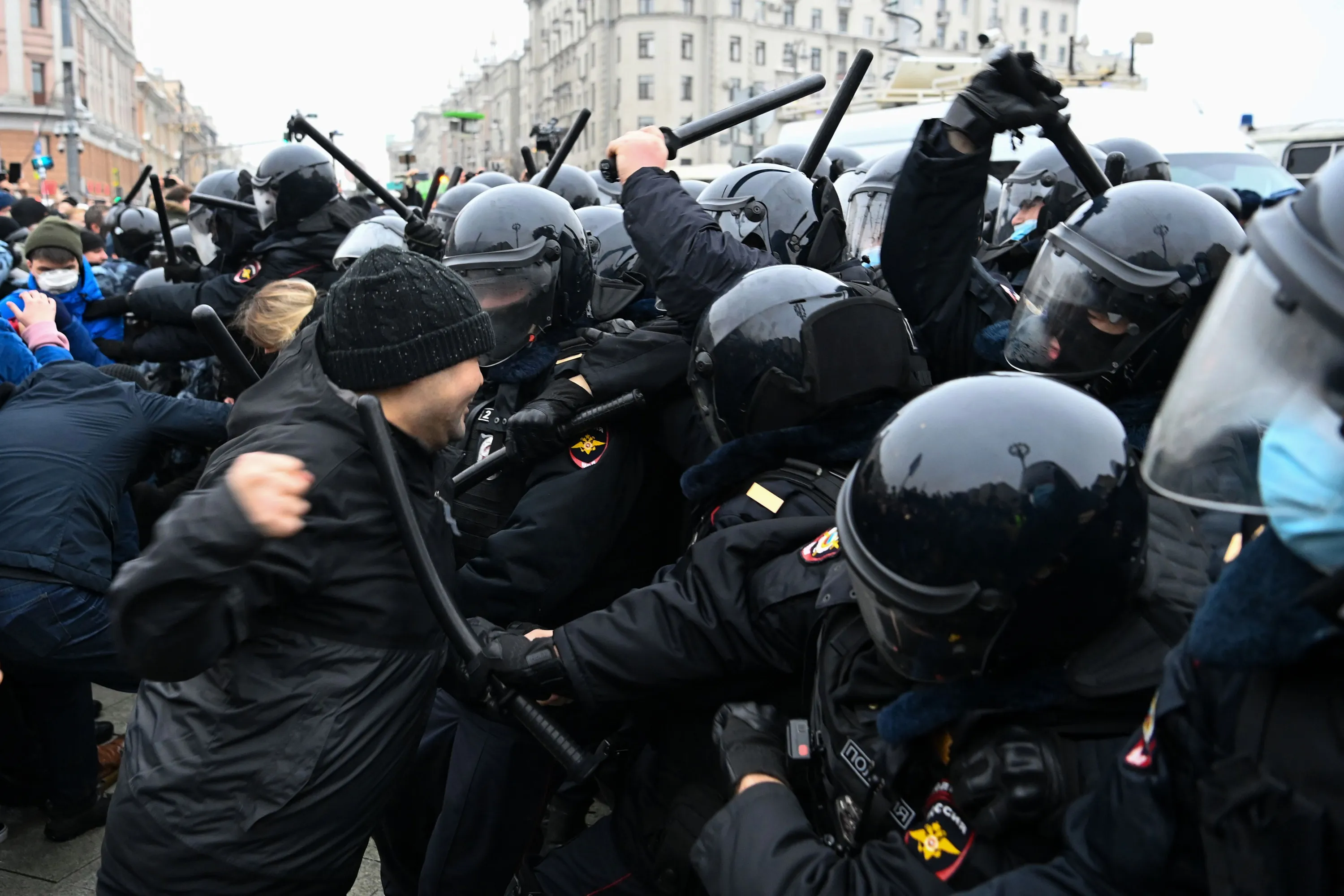 Protesters clash with riot police during a rally in support of jailed opposition leader Alexei Navalny in downtown Moscow on January 23, 2021. (Photo by Kirill Kudryavtsev/AFP Photo)