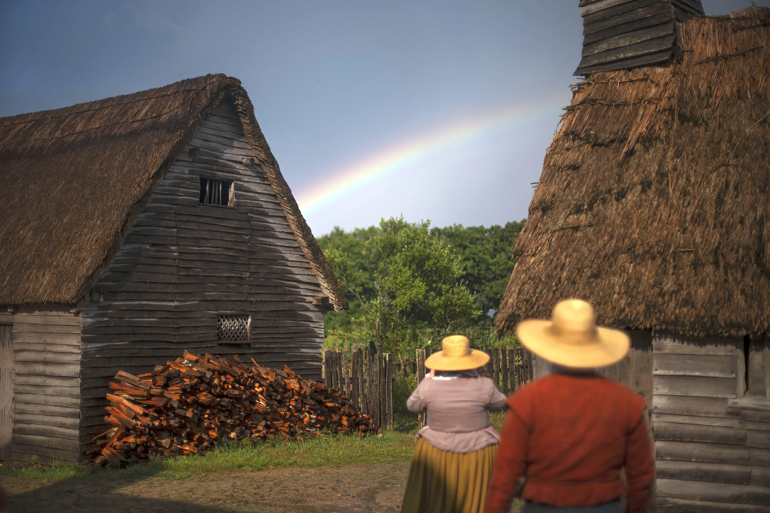 Museum educators playing the role of Pilgrims look at a rainbow over Plimoth Plantation, a living history museum village, Wednesday, August 12, 2020, in Plymouth, Mass. The year 2020 was supposed to be a big one for Pilgrims. Dozens of events, from art exhibits and festivals to lectures and a maritime regatta featuring the Mayflower II, a full-scale replica, were planned to mark the 400th anniversary of the religious separatists' arrival at what we now know as Plymouth, Mass. (Photo by David Goldman/AP Photo)