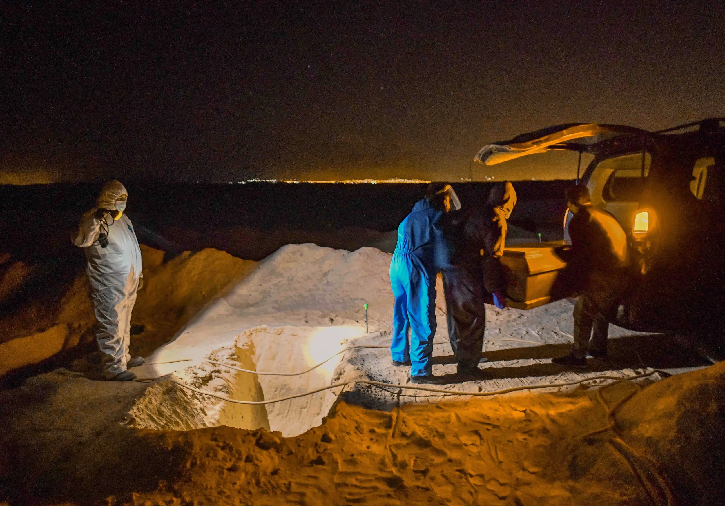 Funerary workers bury a coffin in a massive burial ground for low income people and unidentified victims of Covid-19, opened by the regional government of Arequipa in the highland barren lands of Uchumayo, in the Andes of southern Peru, late on August 14, 2020. Peru is one of the worst hit countries in coronavirus-epicenter Latin America after Brazil and Mexico, with more than 25,000 reported deaths and over half a million cases. (Photo by Diego Ramos/AFP Photo)