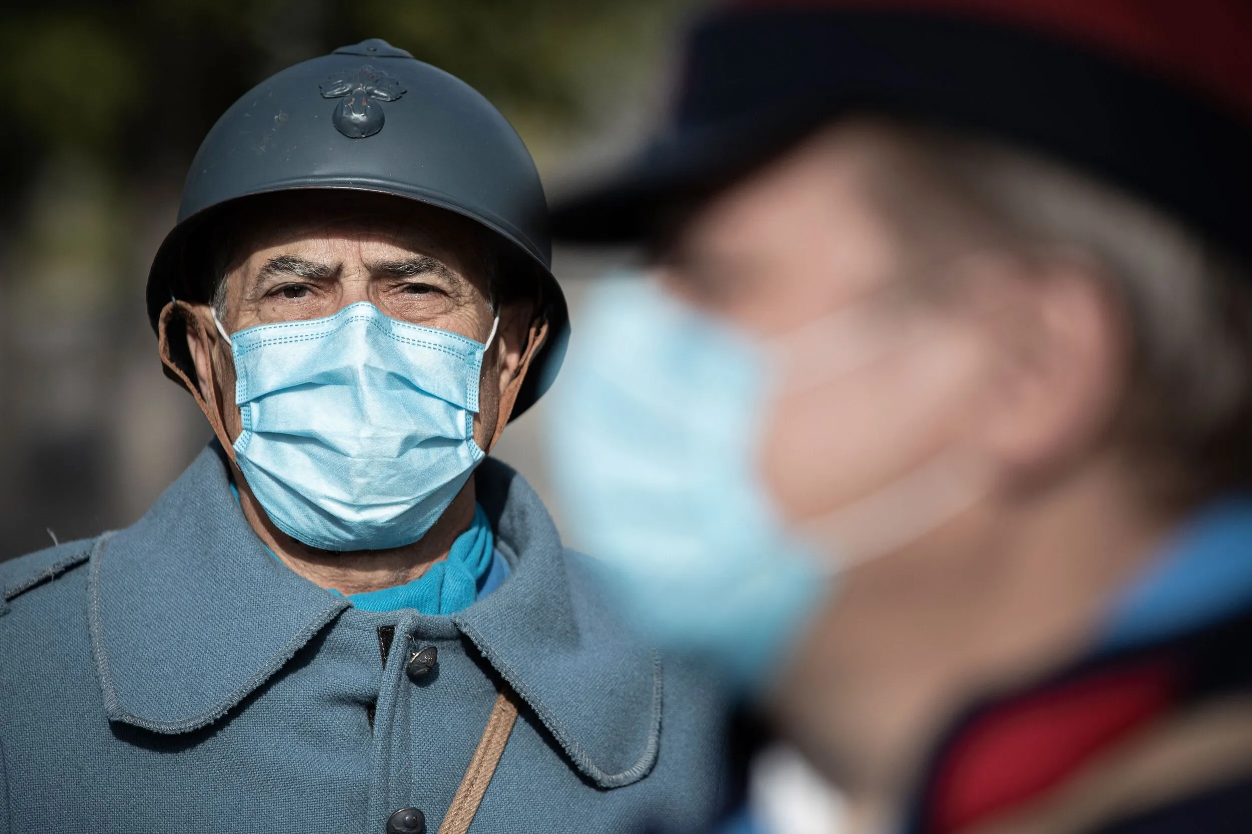 Re-enactors in World War One (WWI) French army uniform, wear protective nose and mouth masks against the novel coronavirus, Covid-19, as they participate in a two day event to mark the 106th anniversary of the Battle of the Marne which took place in September 1914 and which resulted in an Allied victory against the German armies in the west, in Meaux on September 5, 2020. (Photo by Joel Saget/AFP Photo)