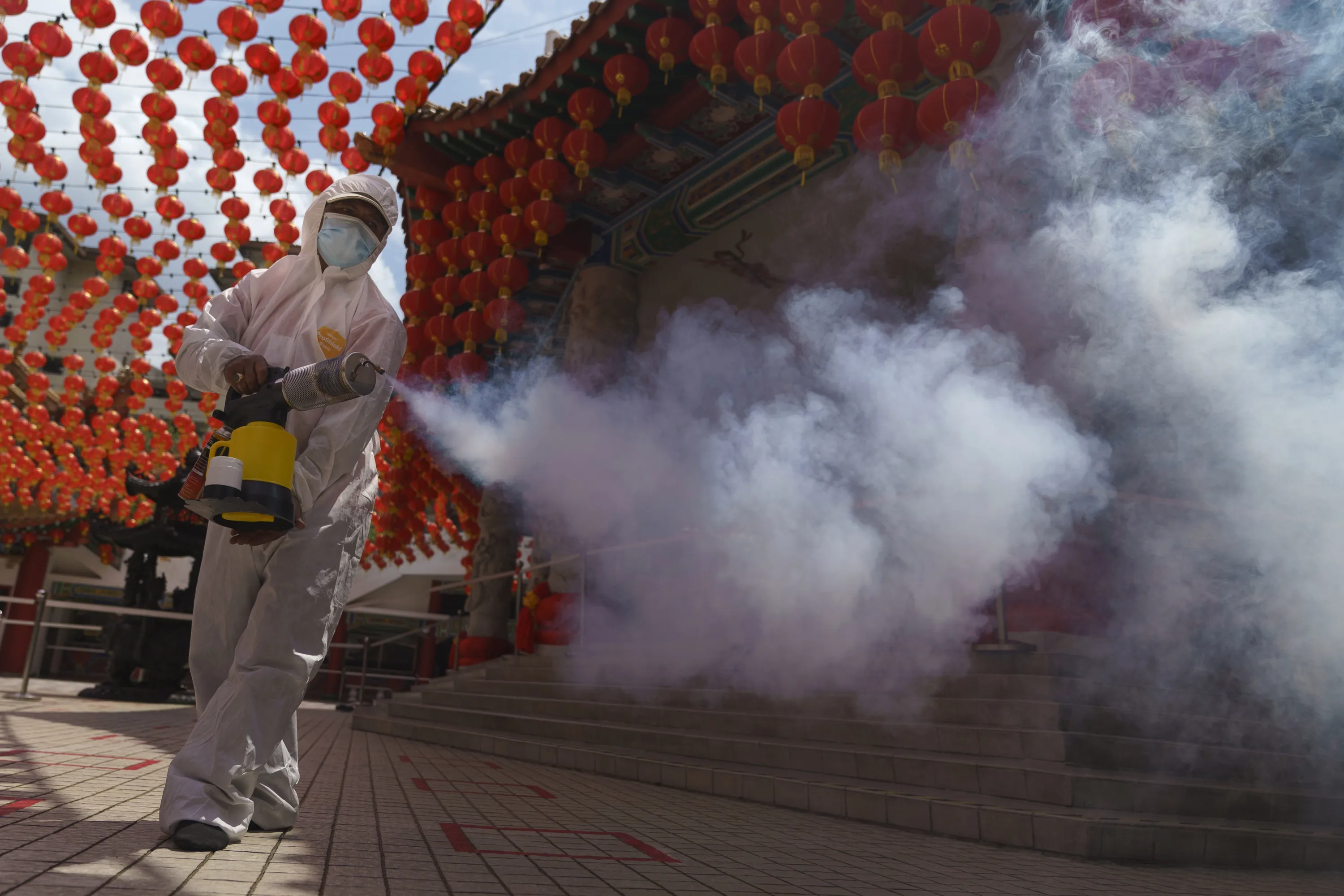A worker disinfects the Thean Hou Temple during during first day of Chinese Lunar New Year celebrations in Kuala Lumpur, Friday, February 12, 2021. The movement control order (MCO) currently enforced across the country to help curb the spread of the coronavirus, has been extended to Feb. 18, effectively covering the Chinese New Year festival that falls on Feb. 12 this year. (Photo by Vincent Thian/AP Photo)