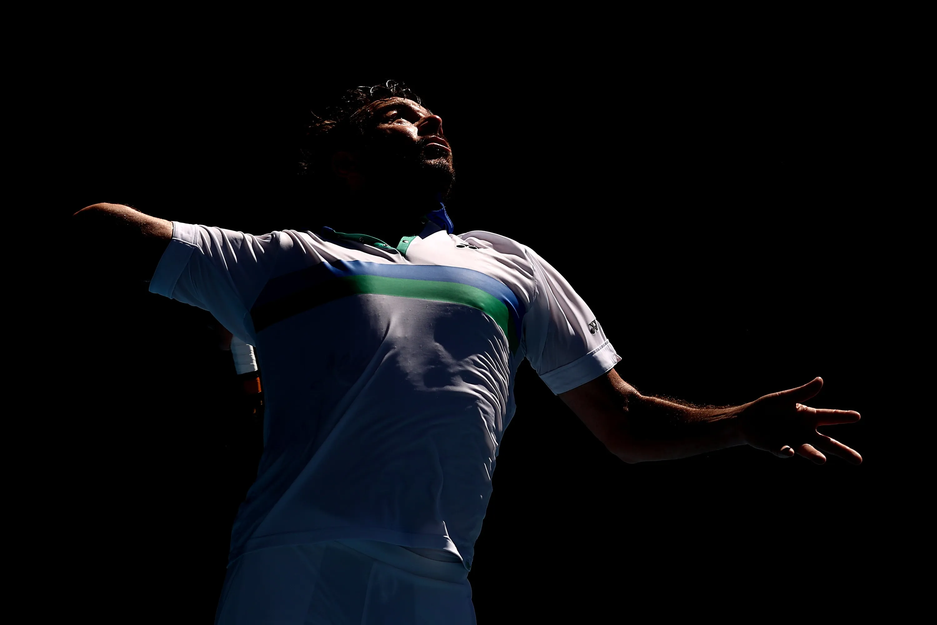 Stan Wawrinka of Switzerland serves in his Men's Singles second round match against Marton Fucsovics of Hungary during day three of the 2021 Australian Open at Melbourne Park on February 10, 2021 in Melbourne, Australia. (Photo by Mark Metcalfe/Getty Images)