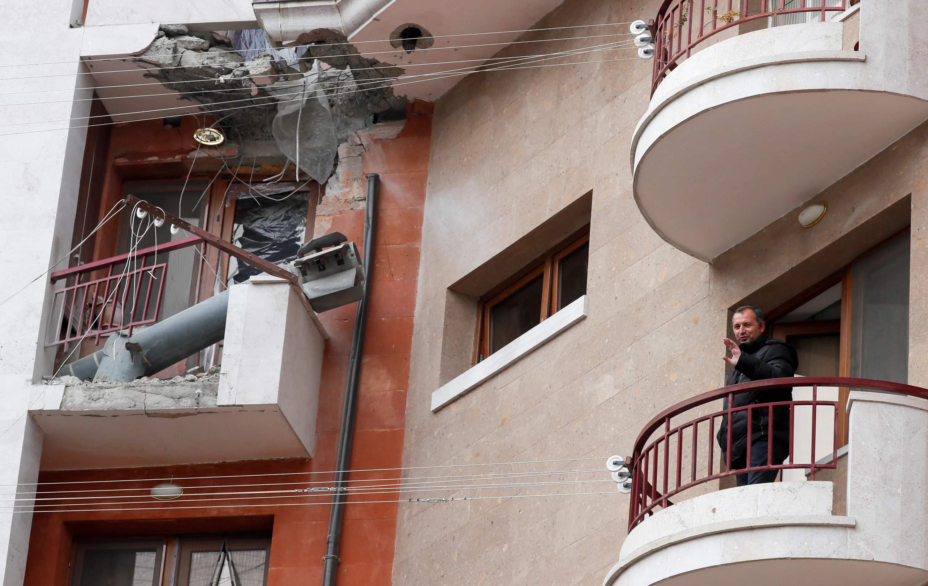 A local resident speaks as he stands near a missile case on a balcony of a residential building in Stepanakert in the region of Nagorno-Karabakh, November 16, 2020. (Photo by Reuters/Stringer)