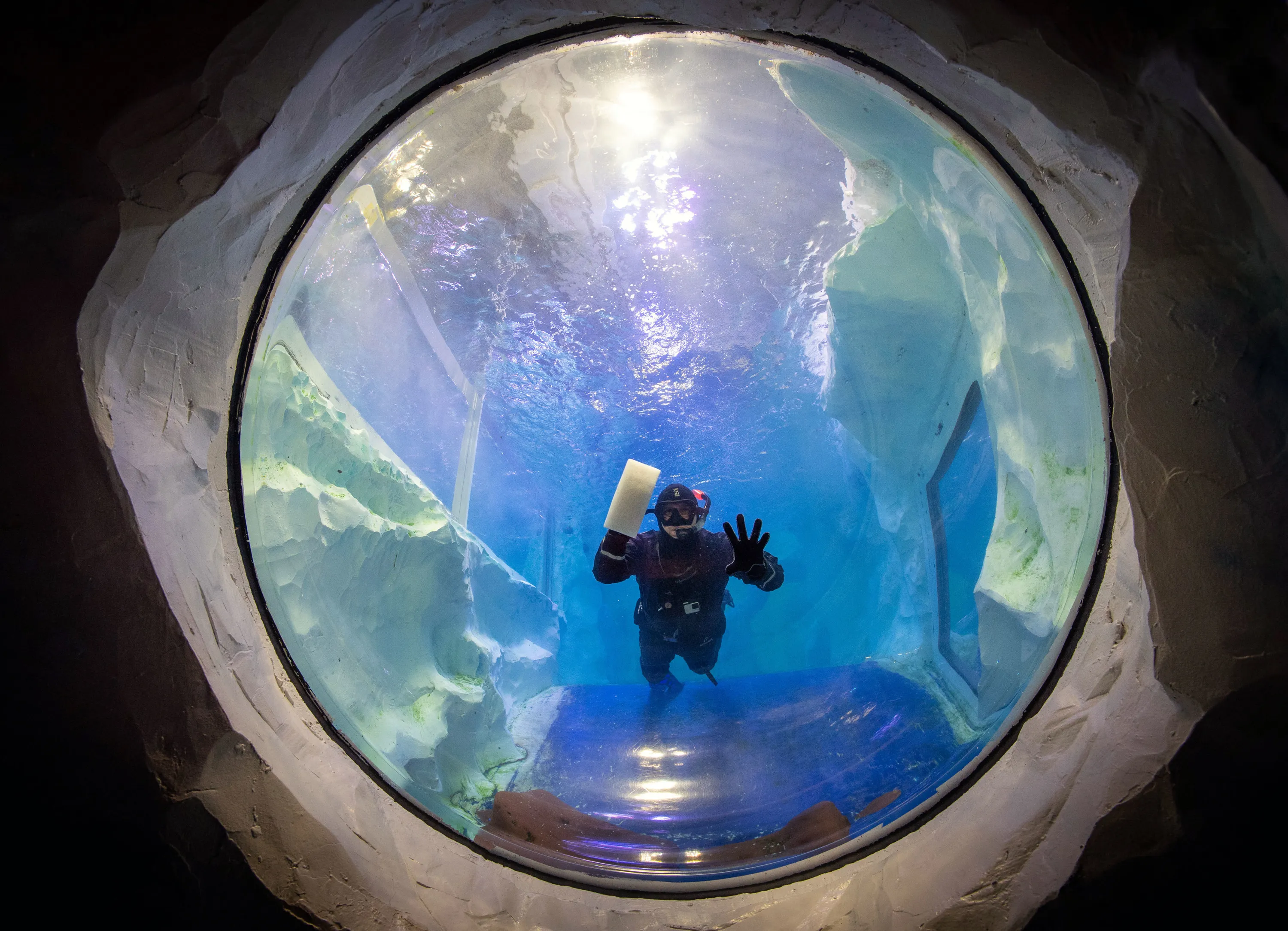 Animal care team member Simon Champion cleans the inside of the penguin pool at the National SEA LIFE Centre in Birmingham, England on November 17, 2020. (Photo by Joe Giddens/PA Images via Getty Images)