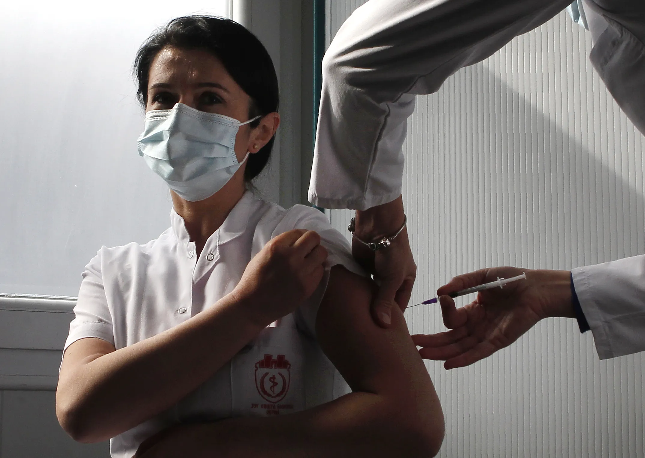 A health worker is administered the Pfizer-BioNTech COVID-19 vaccine on the first day of the vaccination campaign at the Clinique for Infectious Diseases in Skopje, North Macedonia, on Wednesday, February 17, 2021. North Macedonia began administering vaccinations against the coronavirus Wednesday from a first batch of 4,680 doses of Pfizer vaccines donated by neighboring Serbia over the weekend. (Photo by Boris Grdanoski/AP Photo)