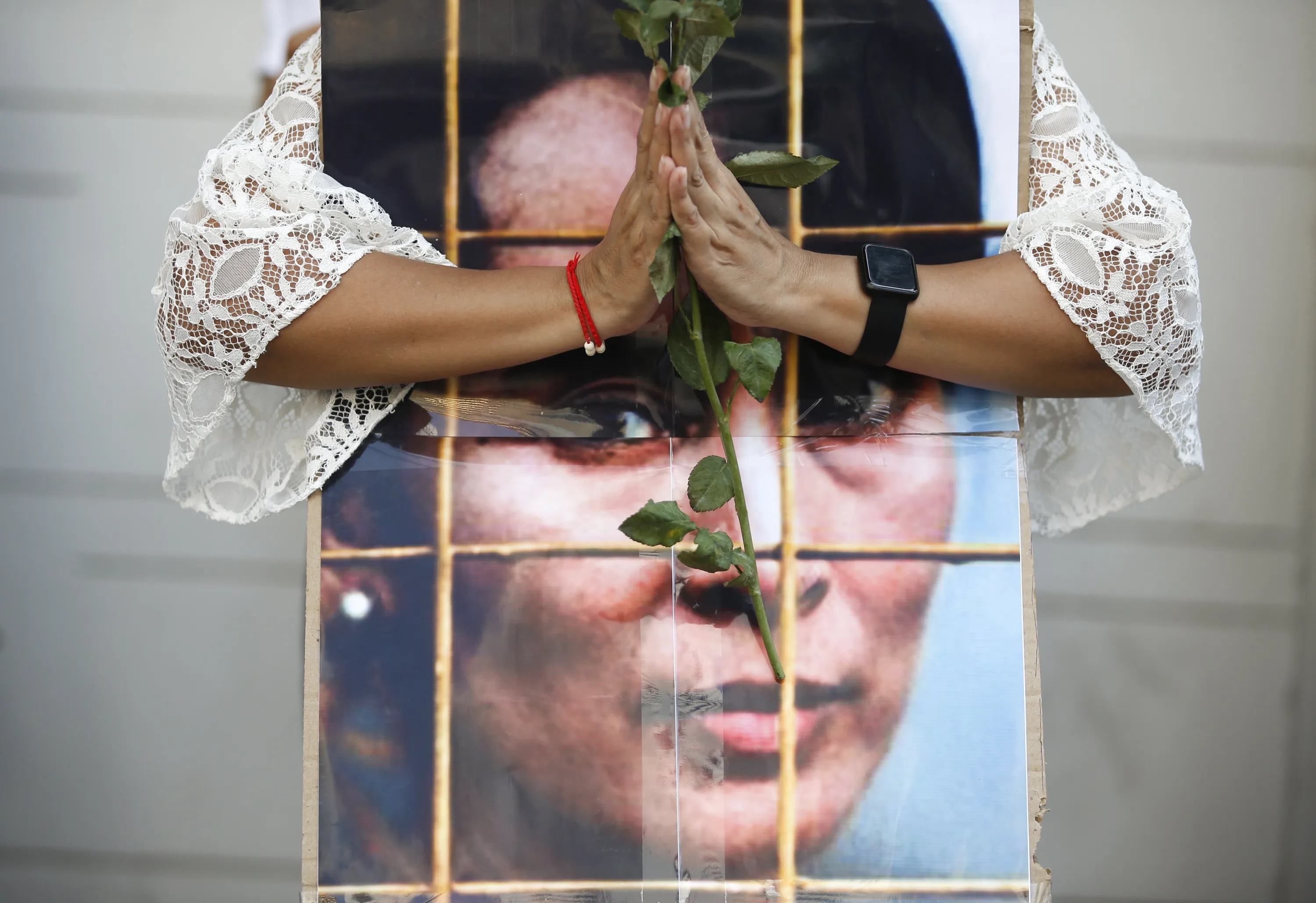 A Myanmar woman living in Thailand holds a rose as she prays for coup ousted detained leader Aung San Suu Kyi during a protest against Indonesian government's alleged support to the junta, at the Indonesian embassy in Bangkok, Thailand, 23 February 2021. Anti-coup protesters gathered to protest following media reports suggesting that Indonesian government is supporting a plan to send observers to Myanmar to ensure that military coup leaders will hold new elections, while protesters are rejecting the suggested plan and want the ousted government to be restored. Myanmar's Aung San Suu Kyi and other top political leaders have been detained after a raid in a military coup due to a tension rising between civilian government and the military disputed from the November 2020 elections results. (Photo by Rungroj Yongrit/EPA/EFE)
