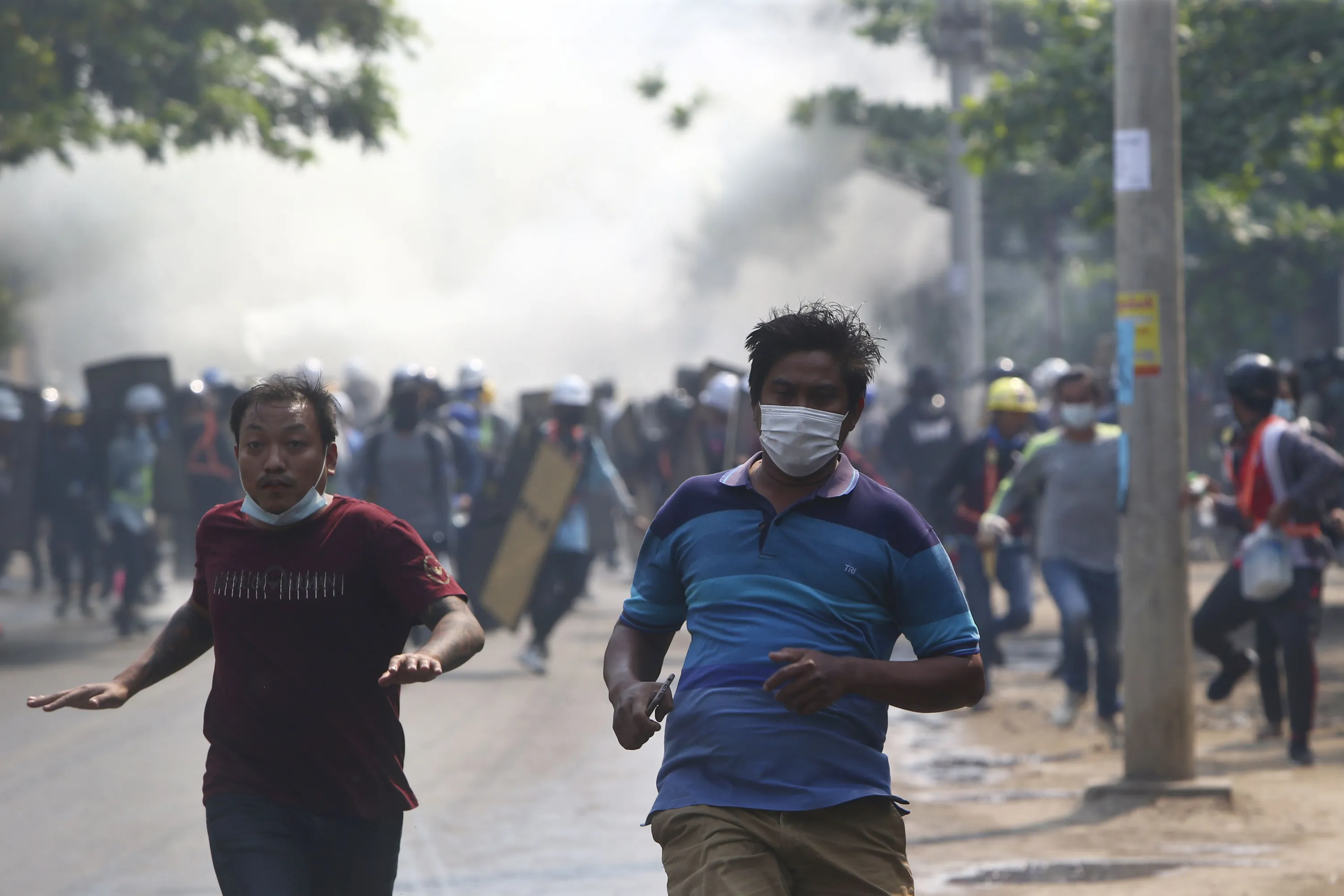 Anti-coup protesters run away when police security forces try to disperse them with tear gas in Mandalay, Myanmar, Saturday, March 13, 2021. Myanmar's military seized power Feb. 1, hours before the seating of a new parliament following election results that were seen as a rebuff to the country's generals. (Photo by AP Photo/Stringer)
