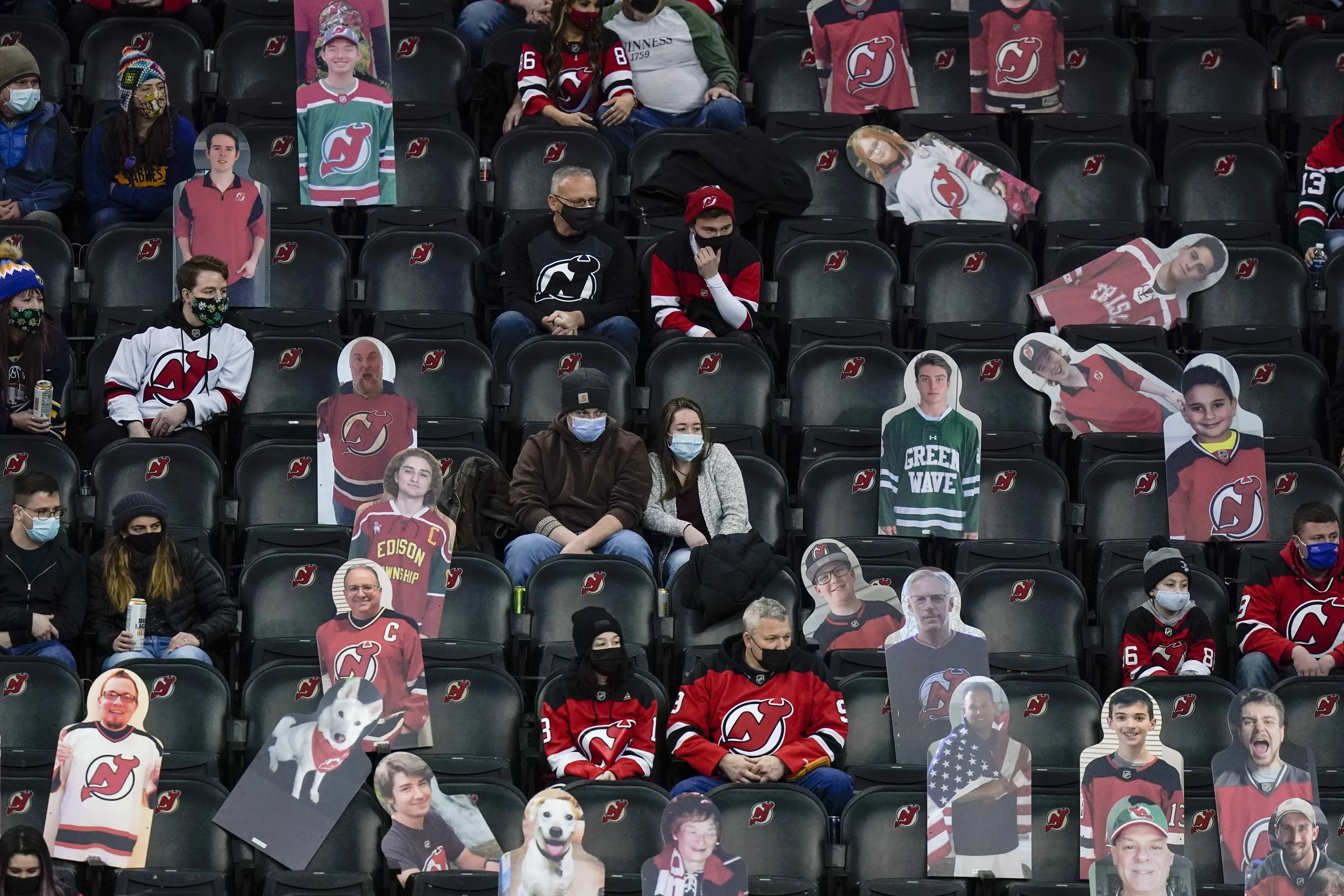 People sit next to cutouts of fans as they watch the first period of an NHL hockey game between the New Jersey Devils and the Buffalo Sabres on Tuesday, March 16, 2021, in Newark, N.J. (Photo by Frank Franklin II/AP Photo)
