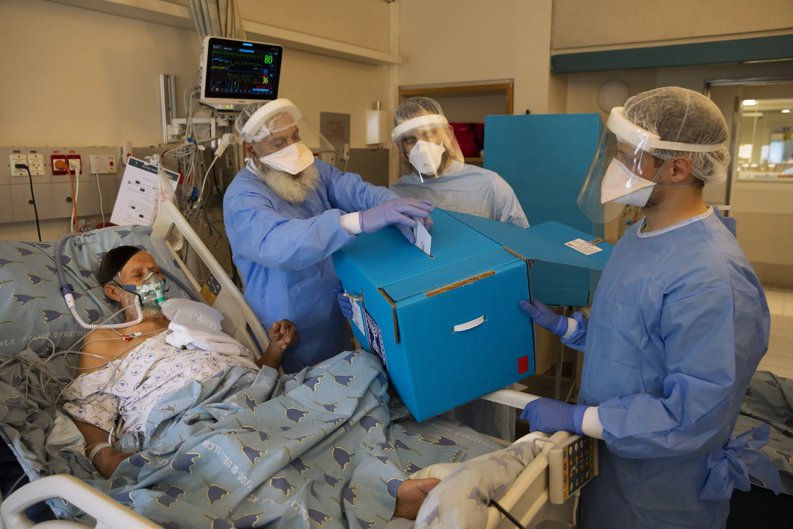 COVID-19 patient Rahamim Havura votes for Israel's parliamentary election inside an intensive care ward for coronavirus patients at Ichilov Hospital in Tel Aviv, Israel, Tuesday, March. 23, 2021. Israel is holding its fourth election in less than two years. (Photo by Oded Balilty/AP Photo)