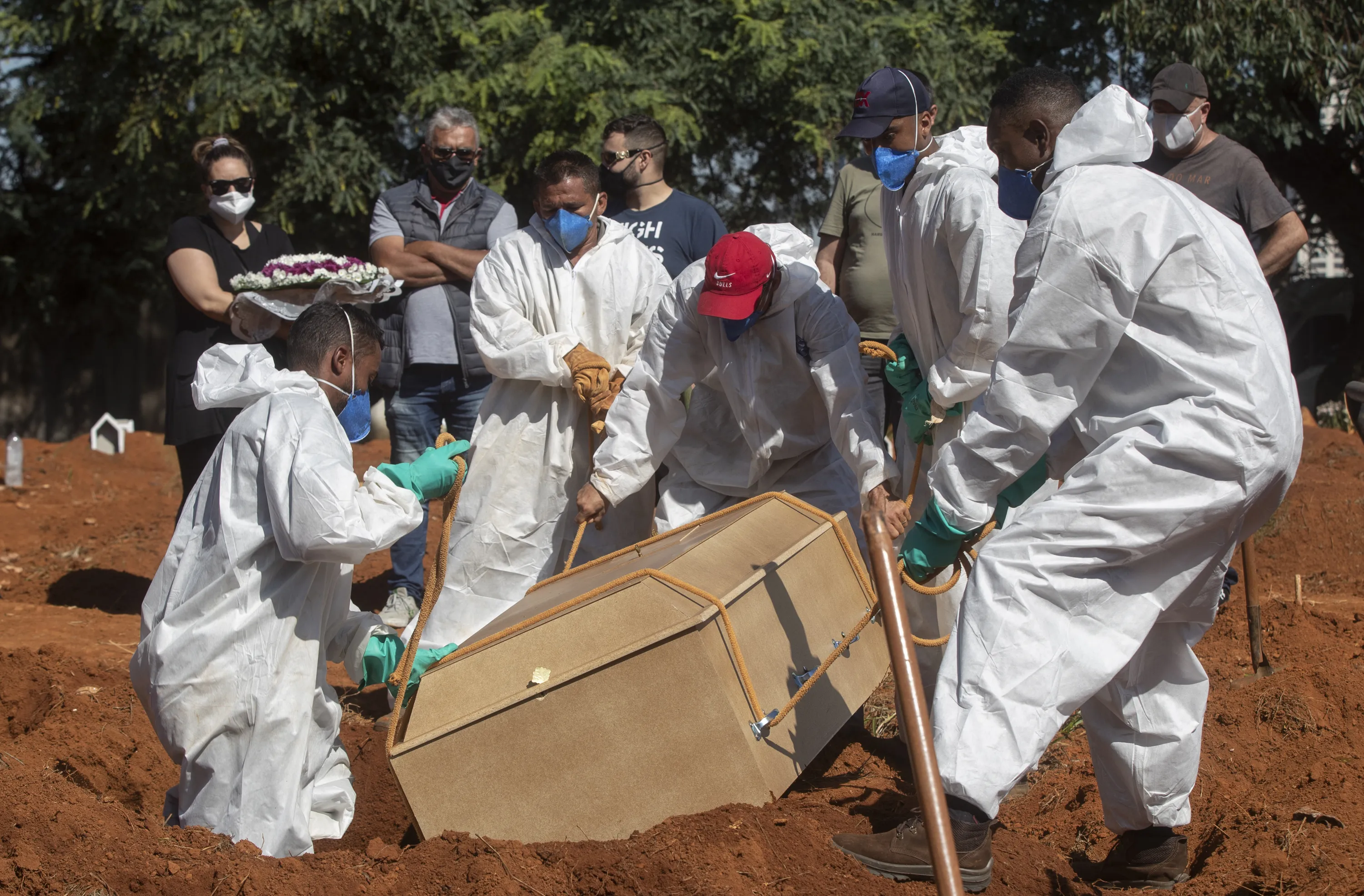 Cemetery workers in full protective gear lower a coffin that contain the remains of a person who died from complications related to COVID-19 at the Vila Formosa cemetery in Sao Paulo, Brazil, Wednesday, March 24, 2021. (Photo by Andre Penner/AP Photo)