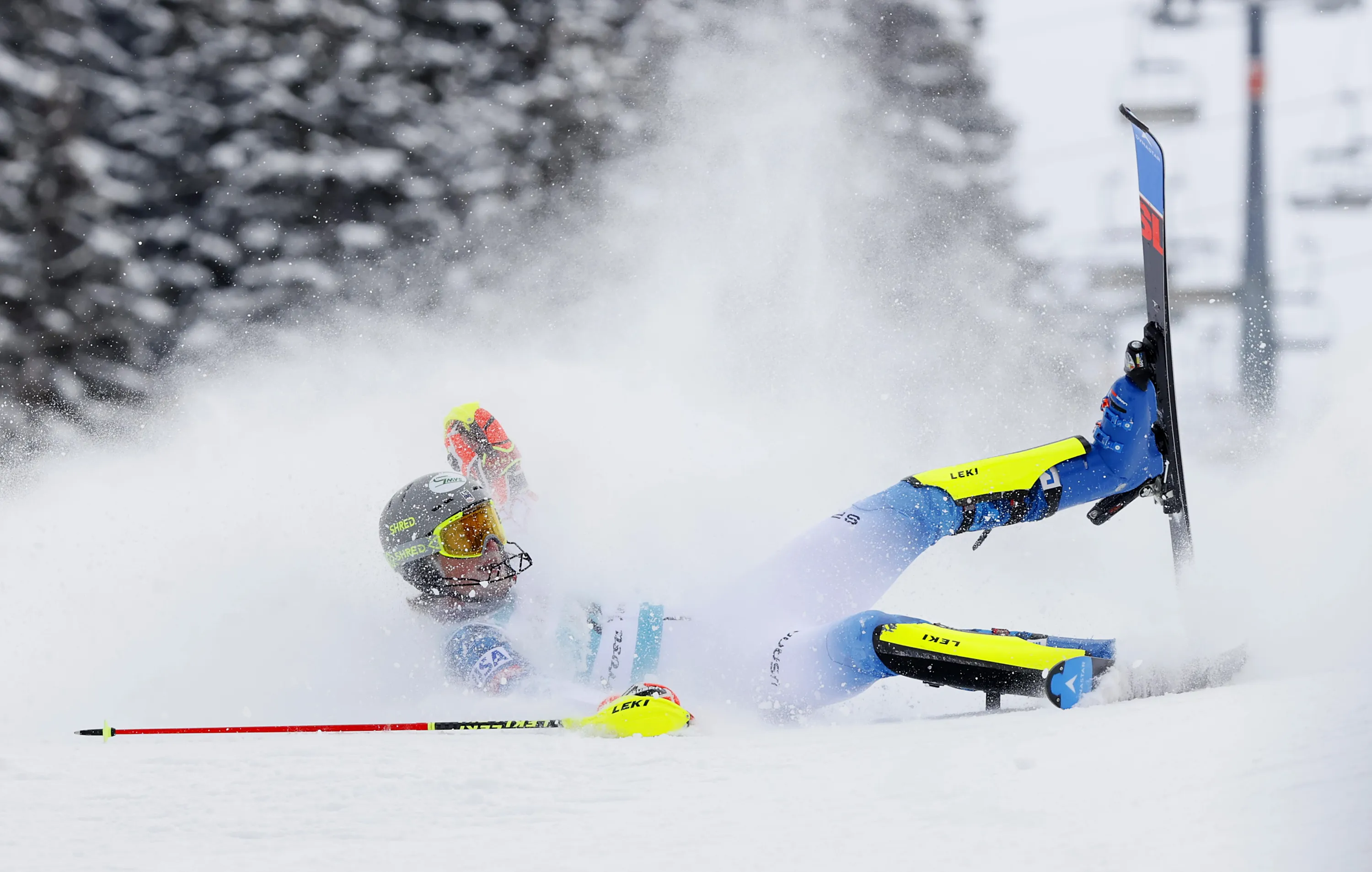 Benjamin Ritchie of the U.S. falls during the Audi FIS Alpine Ski World Cup Team Parallel Slalom on March 21, 2021 in Lenzerheide, Switzerland. (Photo by Denis Balibouse/Reuters)