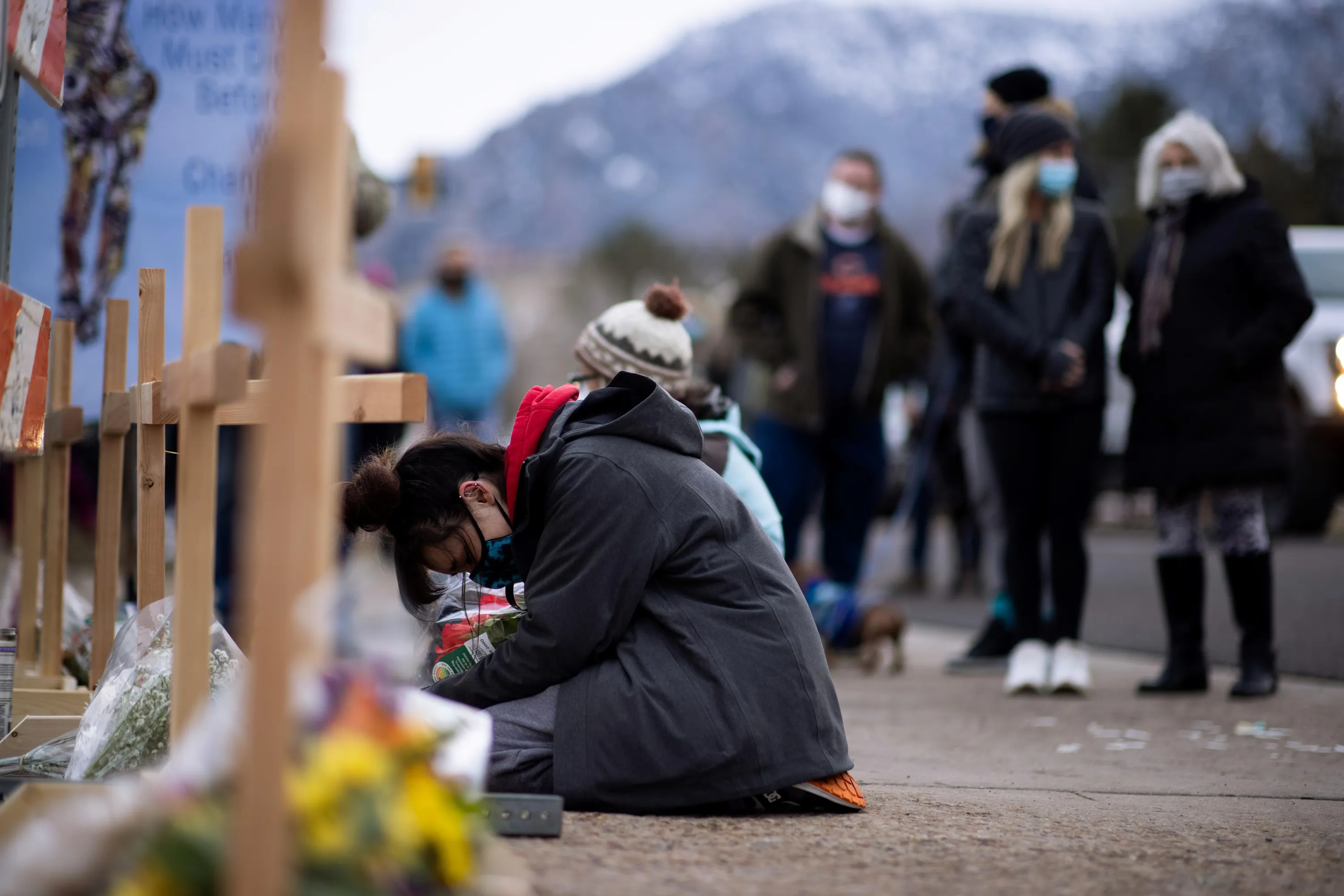 King Soopers employee Starr Samkus, 20, cries at the site of a mass shooting at King Soopers grocery store in Boulder, Colorado, March 23, 2021. Samkus was not working when the shooting occurred. (Photo by Alyson McClaran/Reuters)