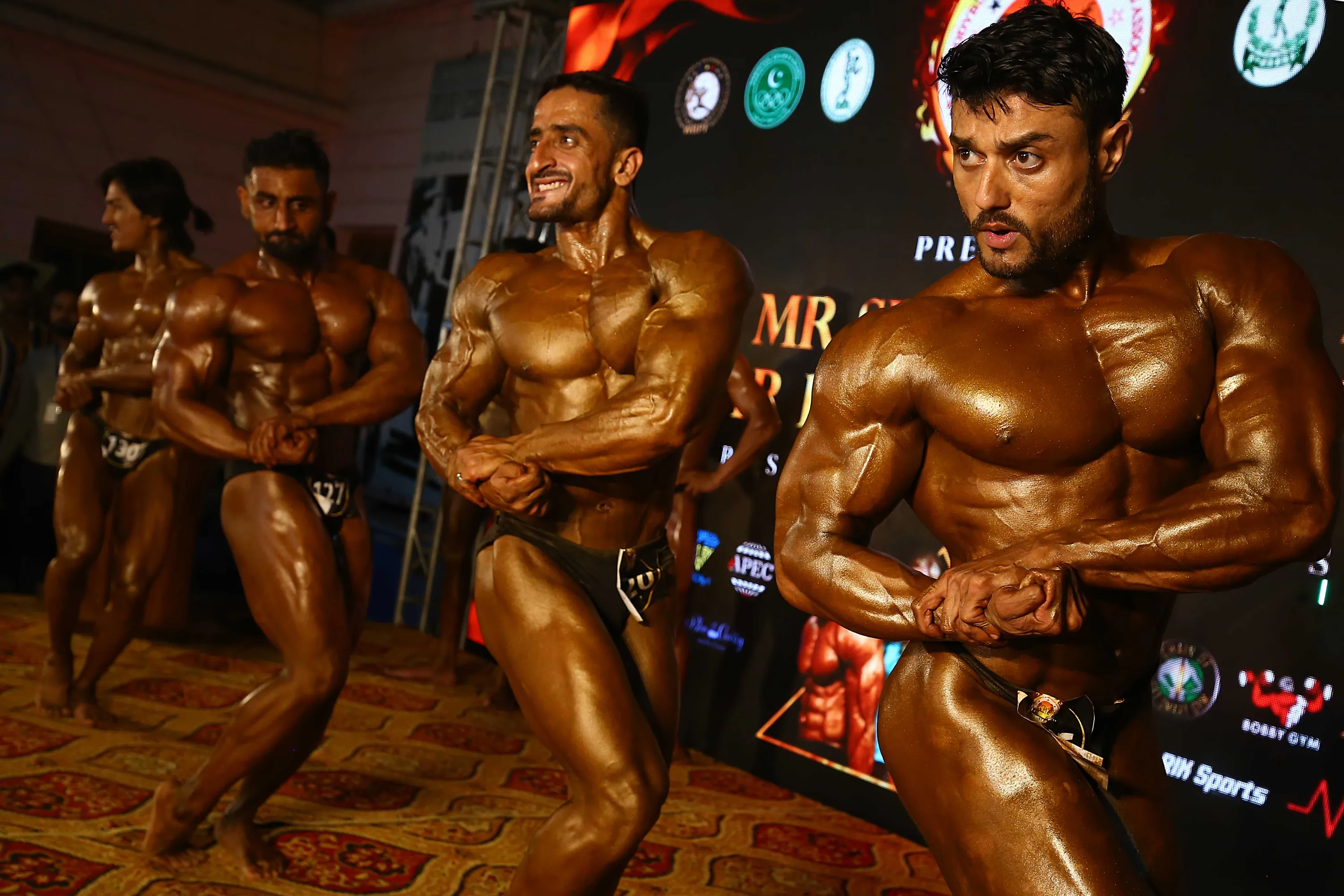 Bodybuilders pose during a body building competition in Karachi, Pakistan, 23 March 2021. The event was organized by the Karachi Body Building Association. (Photo by Shahzaib Akber/EPA/EFE)