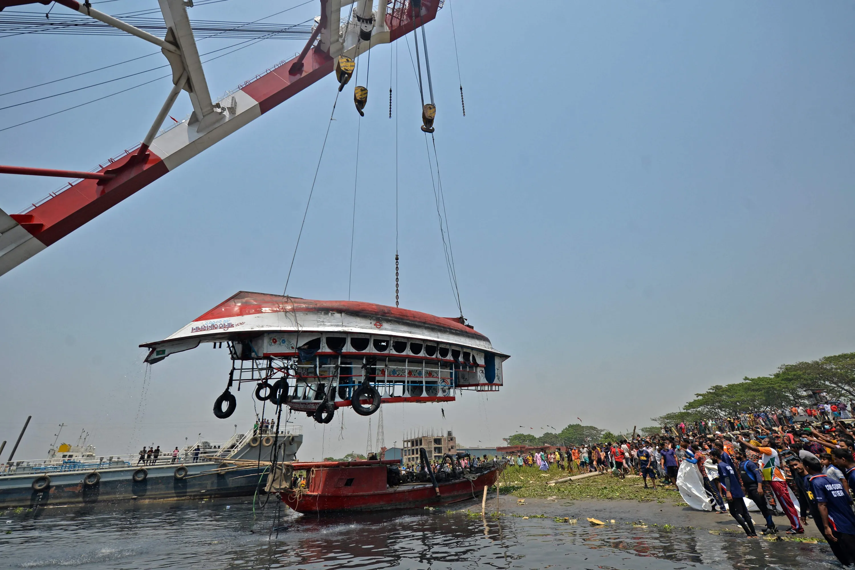 Onlookers and relatives gather after the authorities recovered the capsized boat in Shitalakshya River, in Narayanganj on April 5, 2021. (Photo by Munir Uz Zaman/AFP Photo)