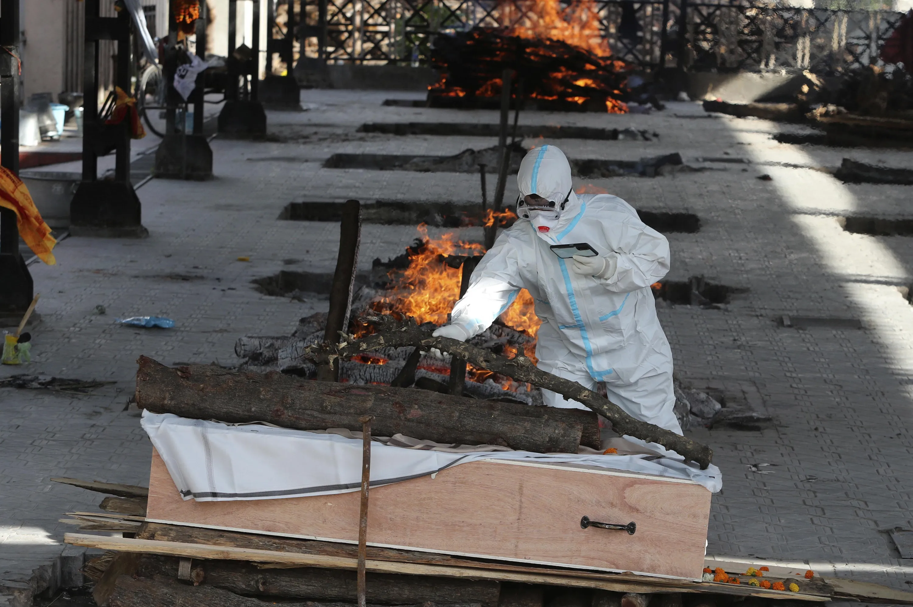 A man performs the final rites of a relative who died of COVID-19, at a crematorium in Jammu, India, Friday, April 23, 2021. India’s underfunded health system is tattering as the world’s worst coronavirus surge wears out the nation, which set another global record in daily infections for a second straight day with 332,730. India has confirmed 16 million cases so far, second only to the United States in a country of nearly 1.4 billion people. (Photo by Channi Anand/AP Photo)
