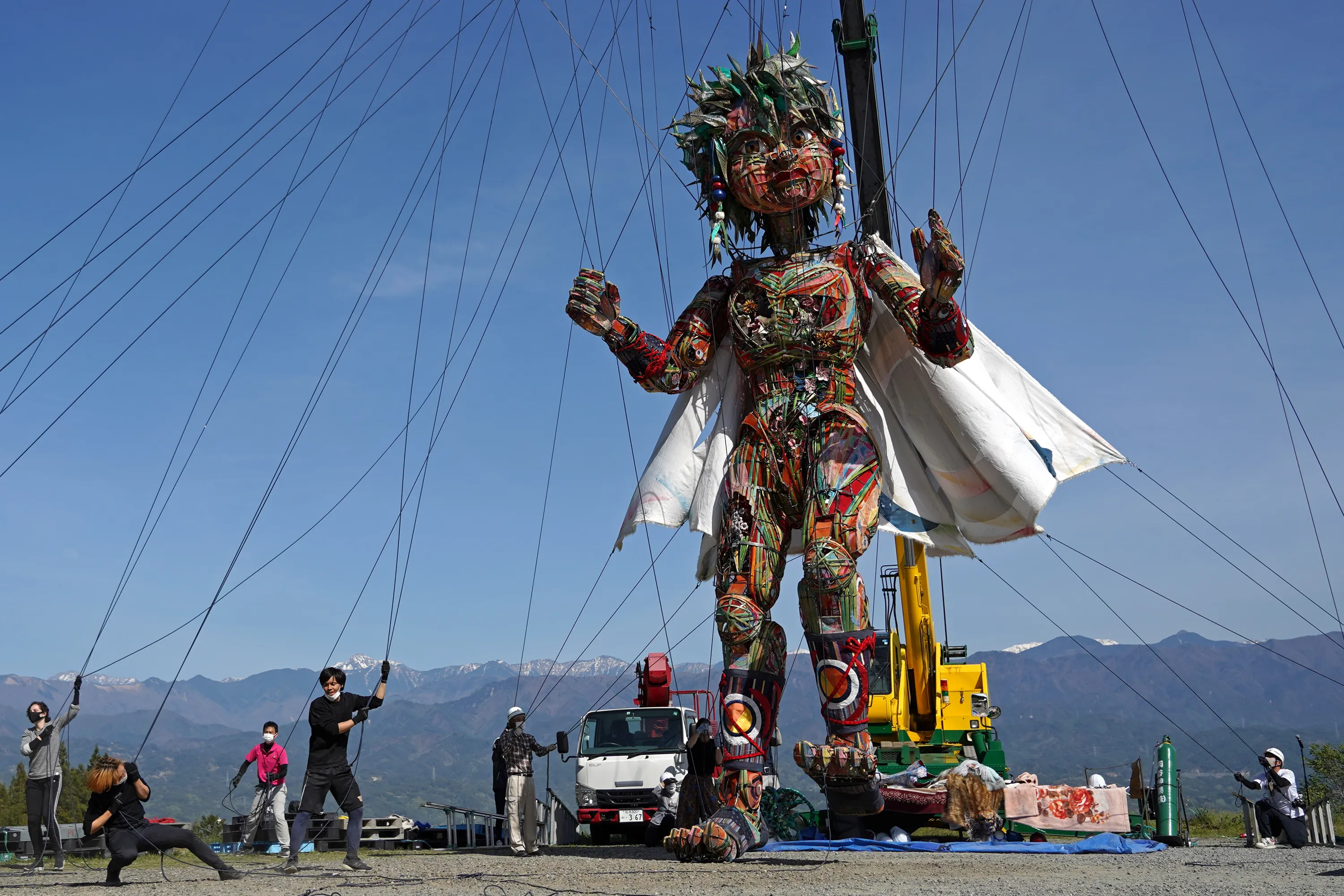 Handlers control the giant puppet MOCCO during a special training session in Takamori, Nagano prefecture, Friday, April 23, 2021. Tokyo 2020 organizers created about 10 meter-tall puppet to symbolize the spirit of the people from the regions affected by the 2011 earthquake and tsunami. The puppet will travel from Tohoku to Tokyo in May to be in place for the games scheduled to open in July. (Photo by Koji Ueda/AP Photo)