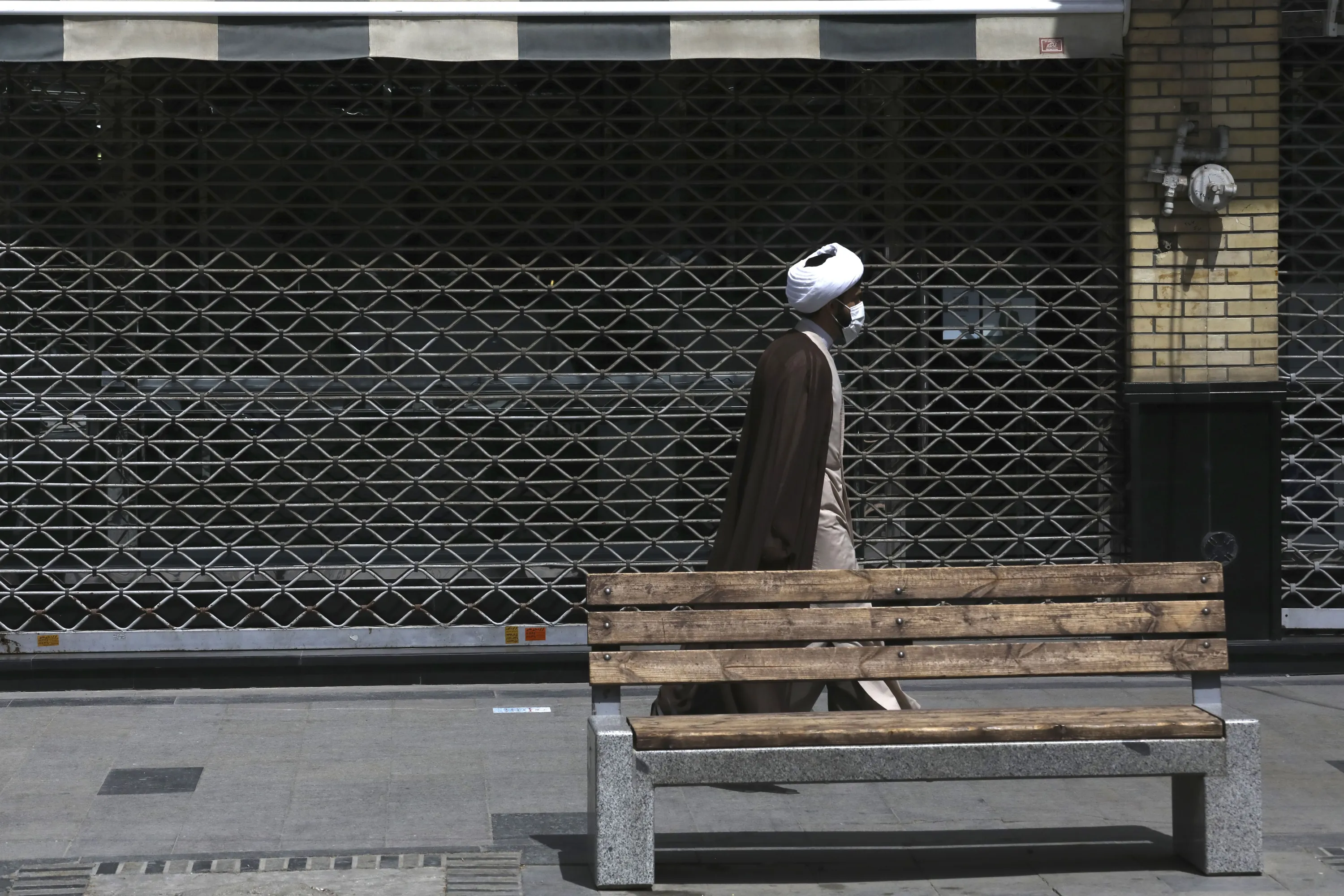 A cleric walks past a closed shop of Tehran's Grand Bazaar, Iran, Saturday, April 10, 2021. Iran on Saturday imposed partial lockdown on businesses in major shopping centers as well as intercity travels through personal cars in major cities including capital Tehran as it struggles with the worst outbreak of the coronavirus in the Mideast region. (Photo by Vahid Salemi/AP Photo)