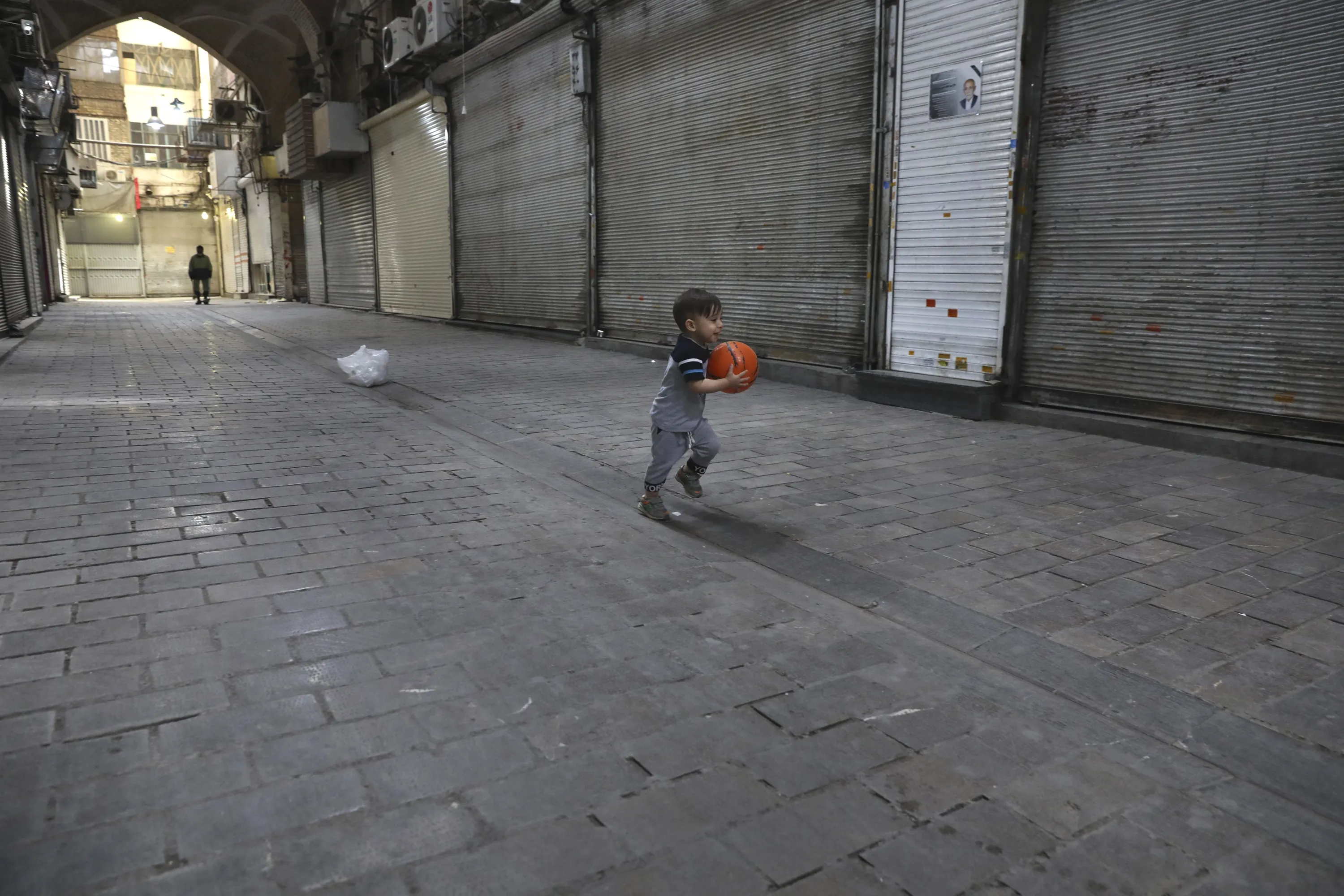 Arman, 2, plays in front of closed shops of Tehran's Grand Bazaar, Iran, Saturday, April 10, 2021. Iran on Saturday imposed partial lockdown on businesses in major shopping centers as well as intercity travels through personal cars in major cities including capital Tehran as it struggles with the worst outbreak of the coronavirus in the Mideast region. (Photo by Vahid Salemi/AP Photo)