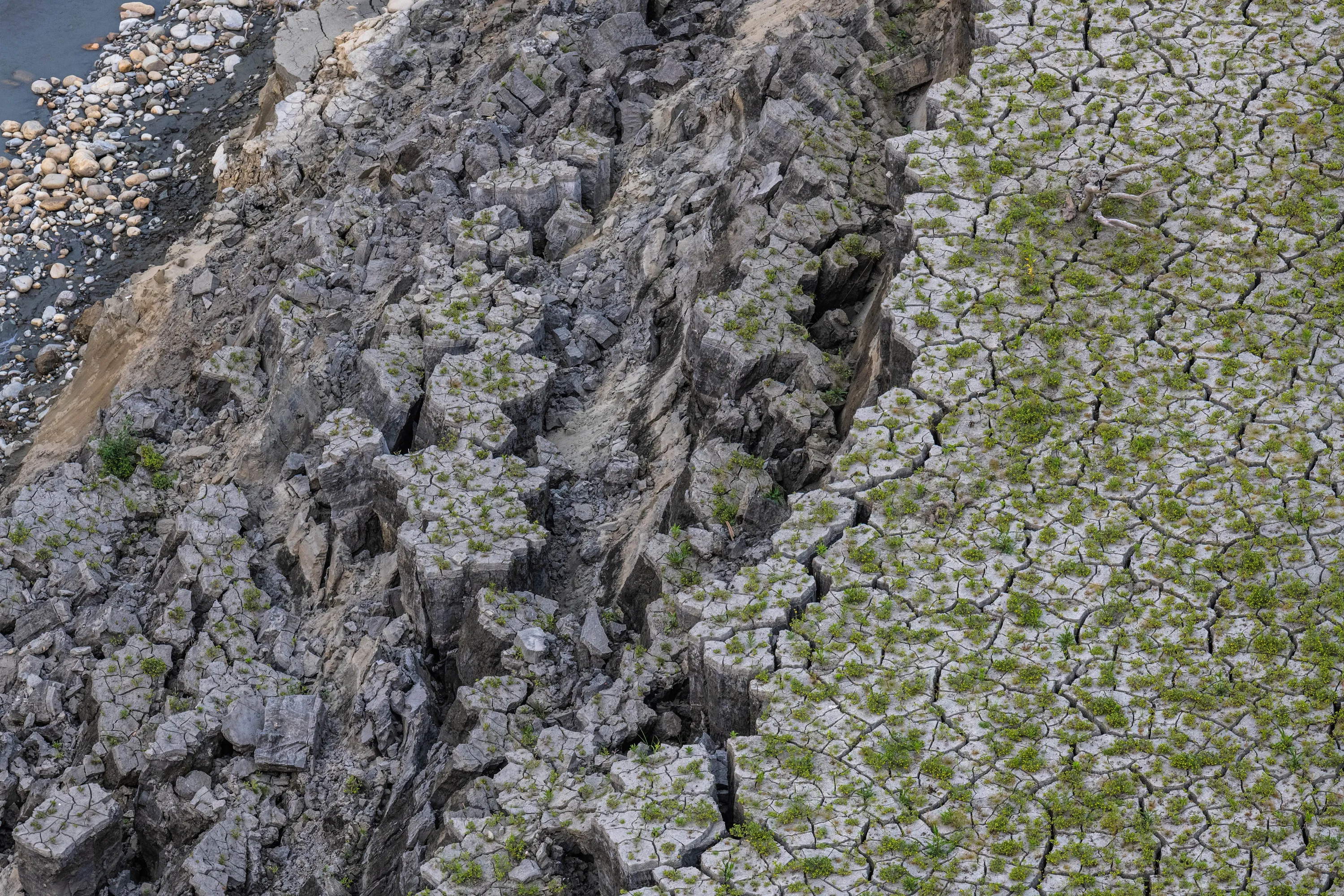Dried reservoir bed at the Liyutan Reservoir on April 18, 2021 in Miaoli, Taiwan. (Photo by Billy H.C. Kwok/Getty Images)