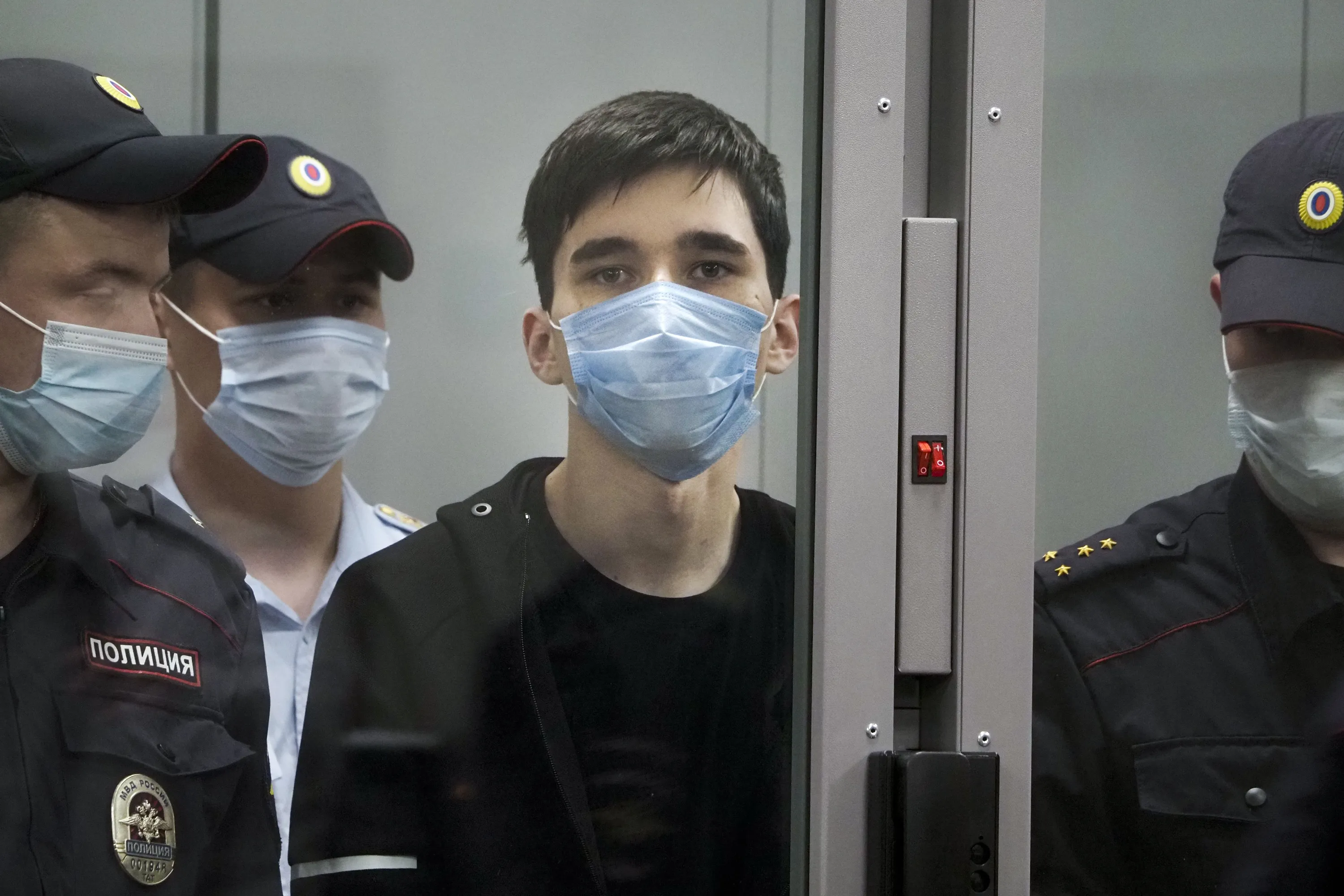 Ilnaz Galyaviyev, centre,wearing a face mask to protect against coronavirus, stands behind a glass, surrounded by police officers during a hearing in a courtroom in Kazan, Russia, Wednesday, May 12, 2021. Russian officials say Galyaviyev attacked a school in the city of Kazan and Russian officials say several people have been killed. Russian media said the gunman was a former student at the school who called himself “a god” on his account on the messaging app Telegram and promised to “kill a large amount of biomass” on the morning of the shooting. Authorities also say over 20 others have been hospitalised with wounds. (Photo by Dmitri Lovetsky/AP Photo)