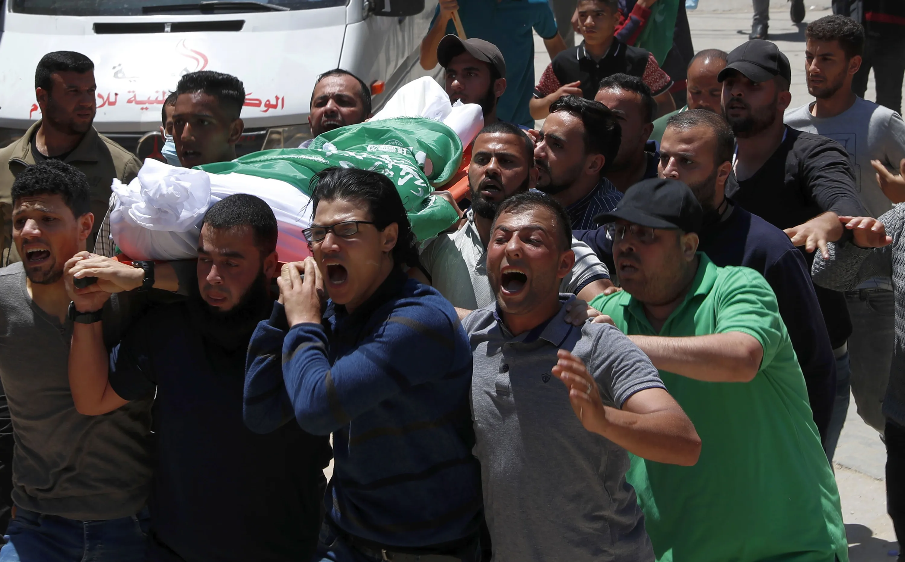Mourners chant Islamic slogans while carrying the body of Awad Abu Selmiya, during a funeral of thirteen Hamas militants outside a mosque in Gaza City, Thursday, May 13, 2021. Gaza residents are bracing for more devastation as militants fire one barrage of rockets after another and Israel carries out waves of airstrikes. (Photo by Adel Hana/AP Photo)