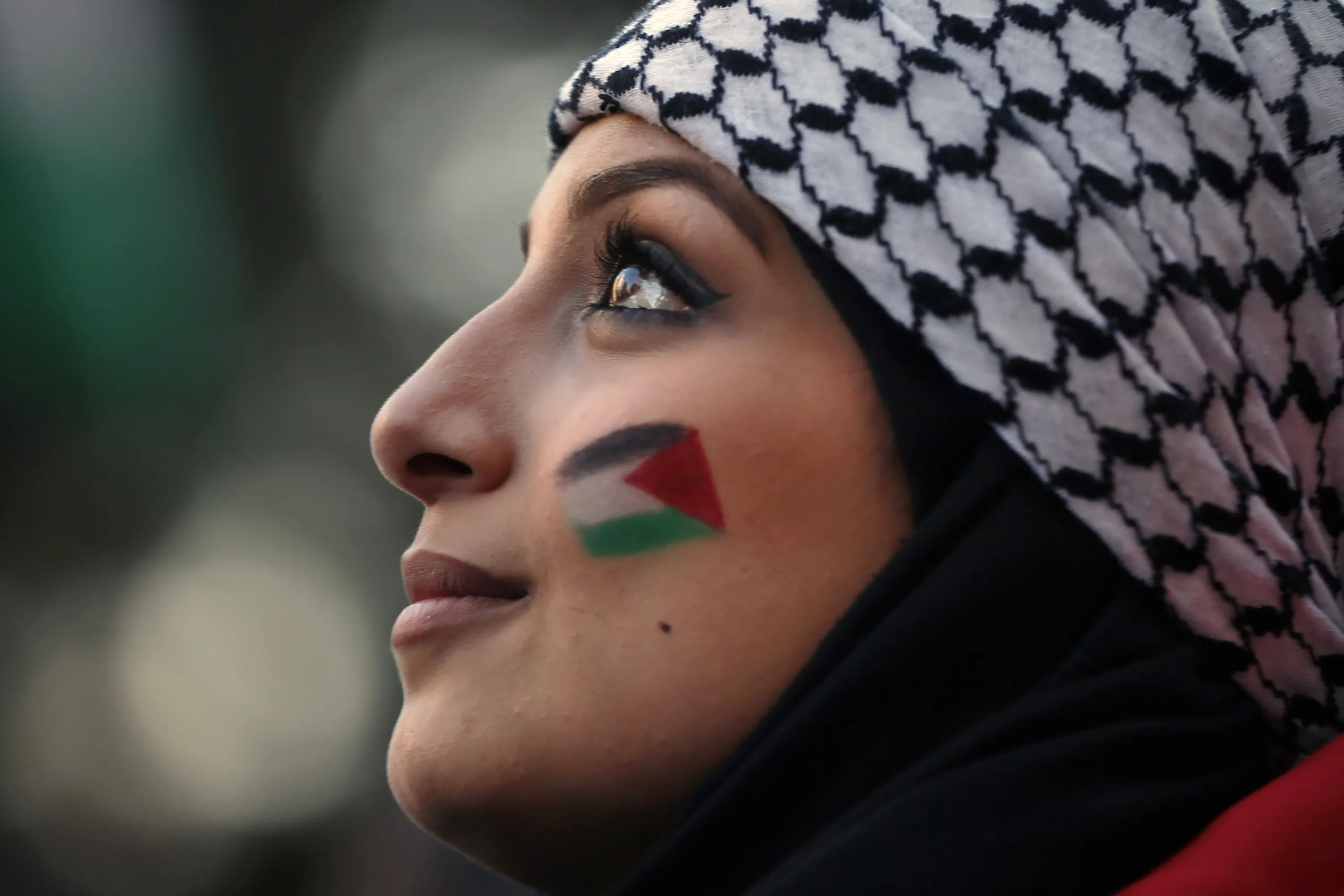 A Palestinian living in Lebanon painted Palestinian flags on her face during a march in support of Palestinians, in Beirut, Lebanon, Tuesday, May 18, 2021. (Photo by Bilal Hussein/AP Photo)