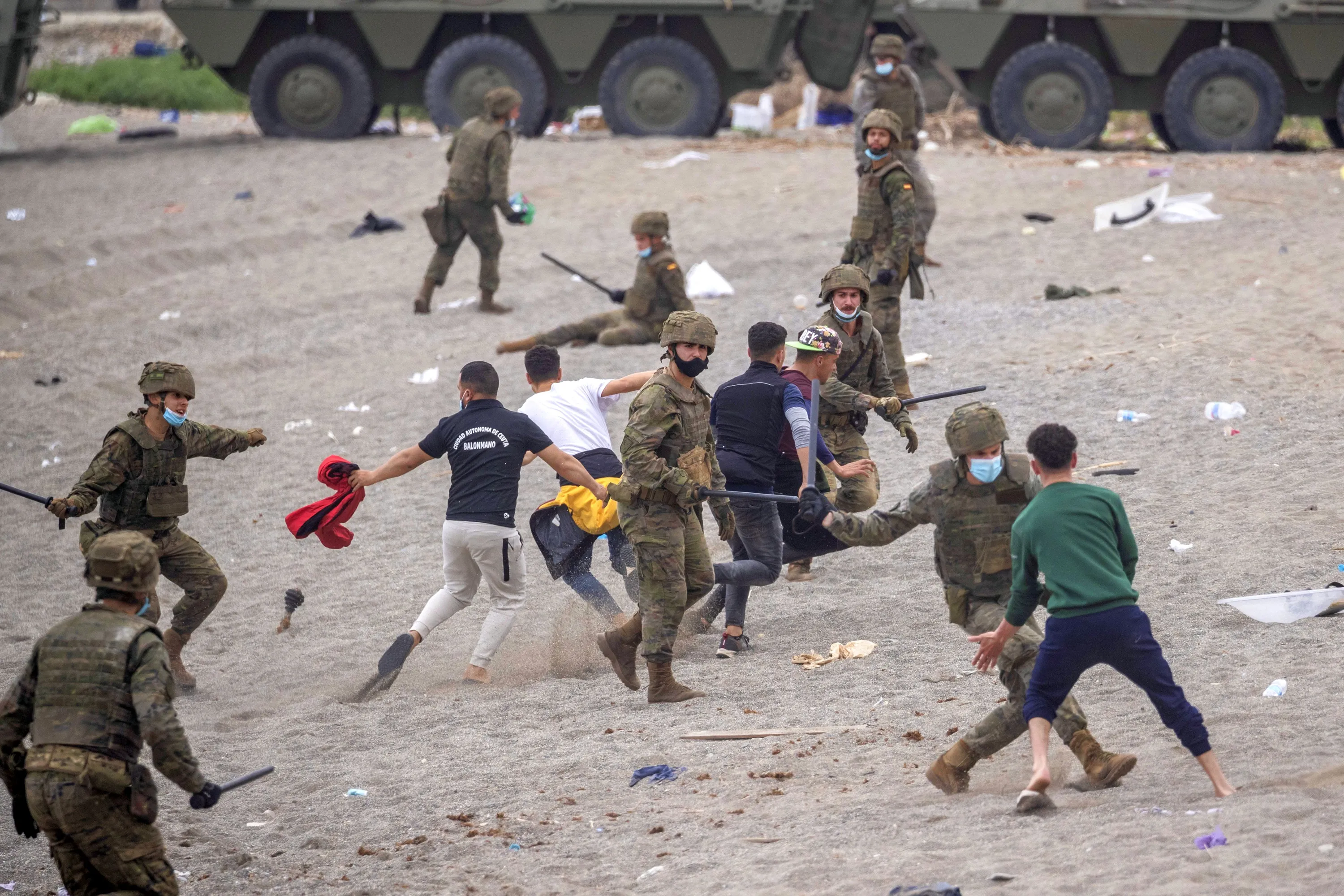 Spanish Army soldiers clash with migrants near the border of Morocco and Spain, at the Spanish enclave of Ceuta, on Tuesday, May 18, 2021. Ceuta, a Spanish city of 85,000 in northern Africa, faces a humanitarian crisis after thousands of Moroccans took advantage of relaxed border control in their country to swim or paddle in inflatable boats into European soil. (Photo by Bernat Armangue/AP Photo)