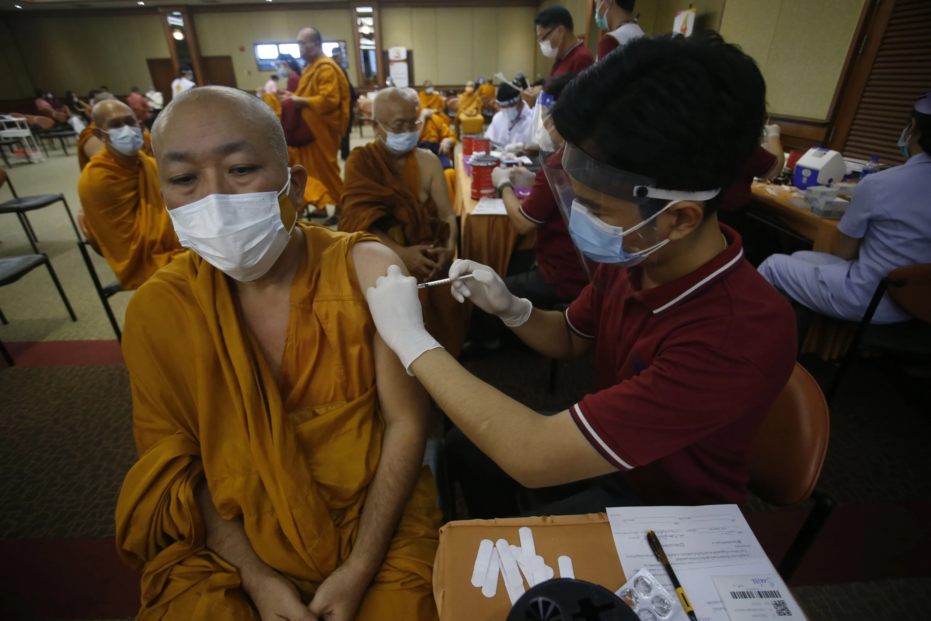 A health worker administers a dose of the Sinovac COVID-19 vaccine to Buddhist monk at Priest Hospital in Bangkok, Thailand Tuesday, May 18, 2021. Thailand had about 7,100 cases, including 63 deaths, in all of last year, in what was regarded as a success story. Taxi drivers are starved for customers, weddings are suddenly canceled, schools are closed, and restaurant service is restricted across much of Asia as the coronavirus makes a resurgence in countries where it had seemed to be well under control. (Photo by Anuthep Cheysakron/AP Photo)