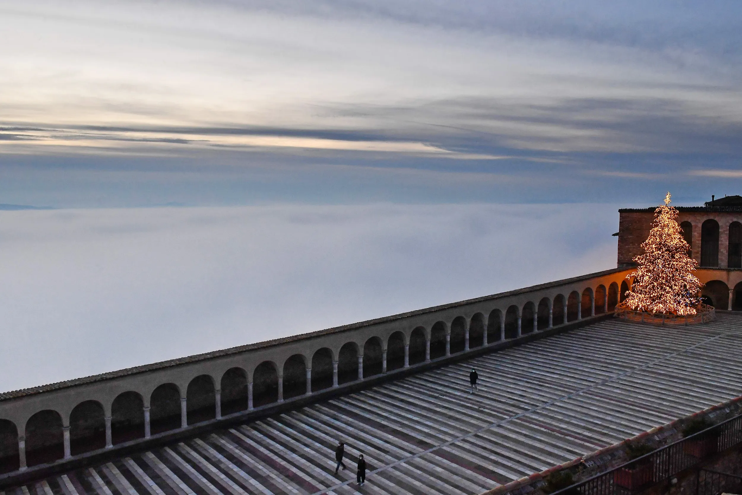 This photograph taken on December 11, 2020 shows fog that covers the valley in Assisi as the sun sets. (Photo by Tiziana Fabi/AFP Photo)