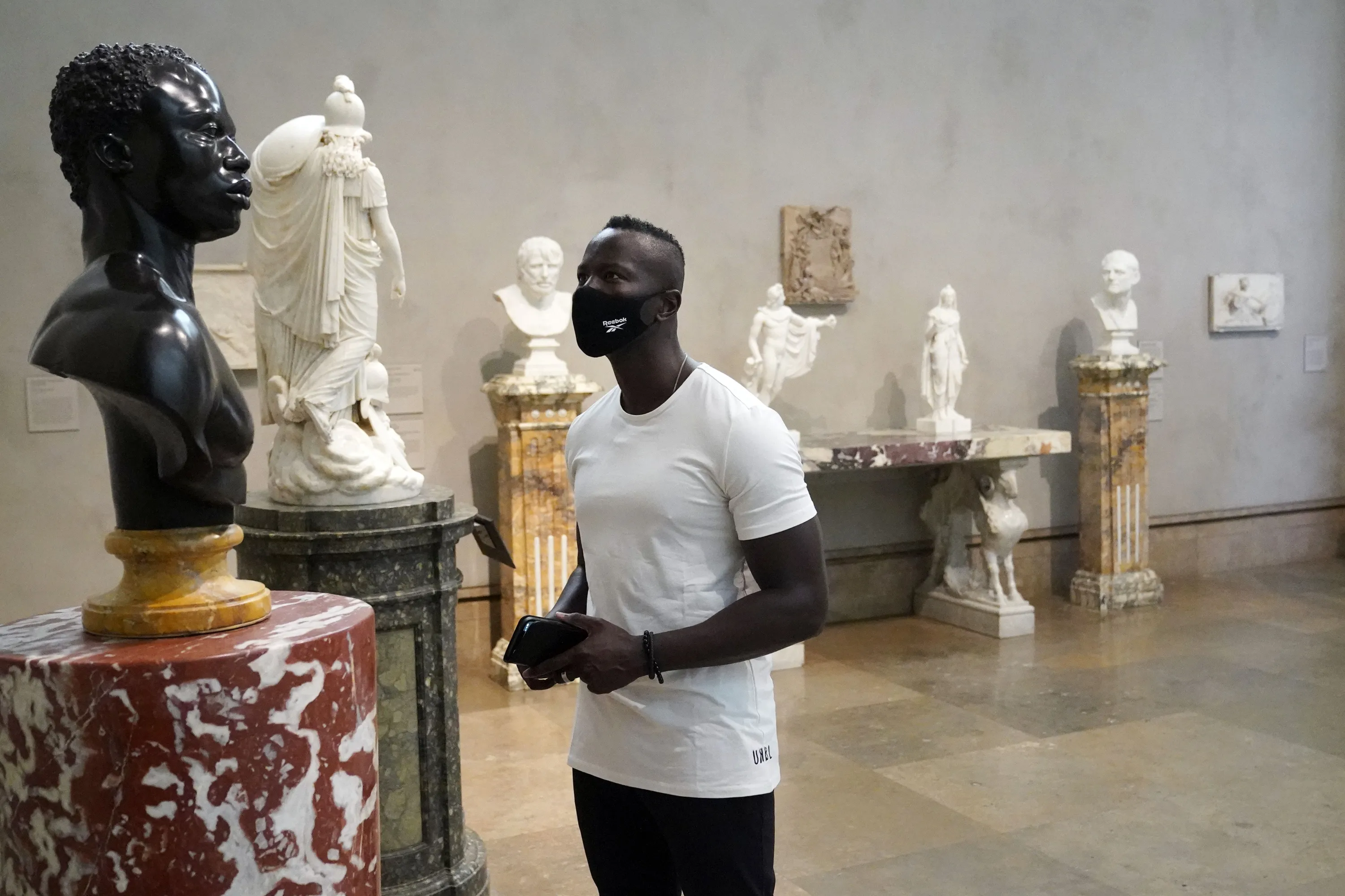 Timothy Musomba wears a mask while viewing sculptures at the newly re-opened Getty Center amid the COVID-19 pandemi,c Wednesday, May 26, 2021, in Los Angeles. (Photo by Marcio Jose Sanchez/AP Photo)