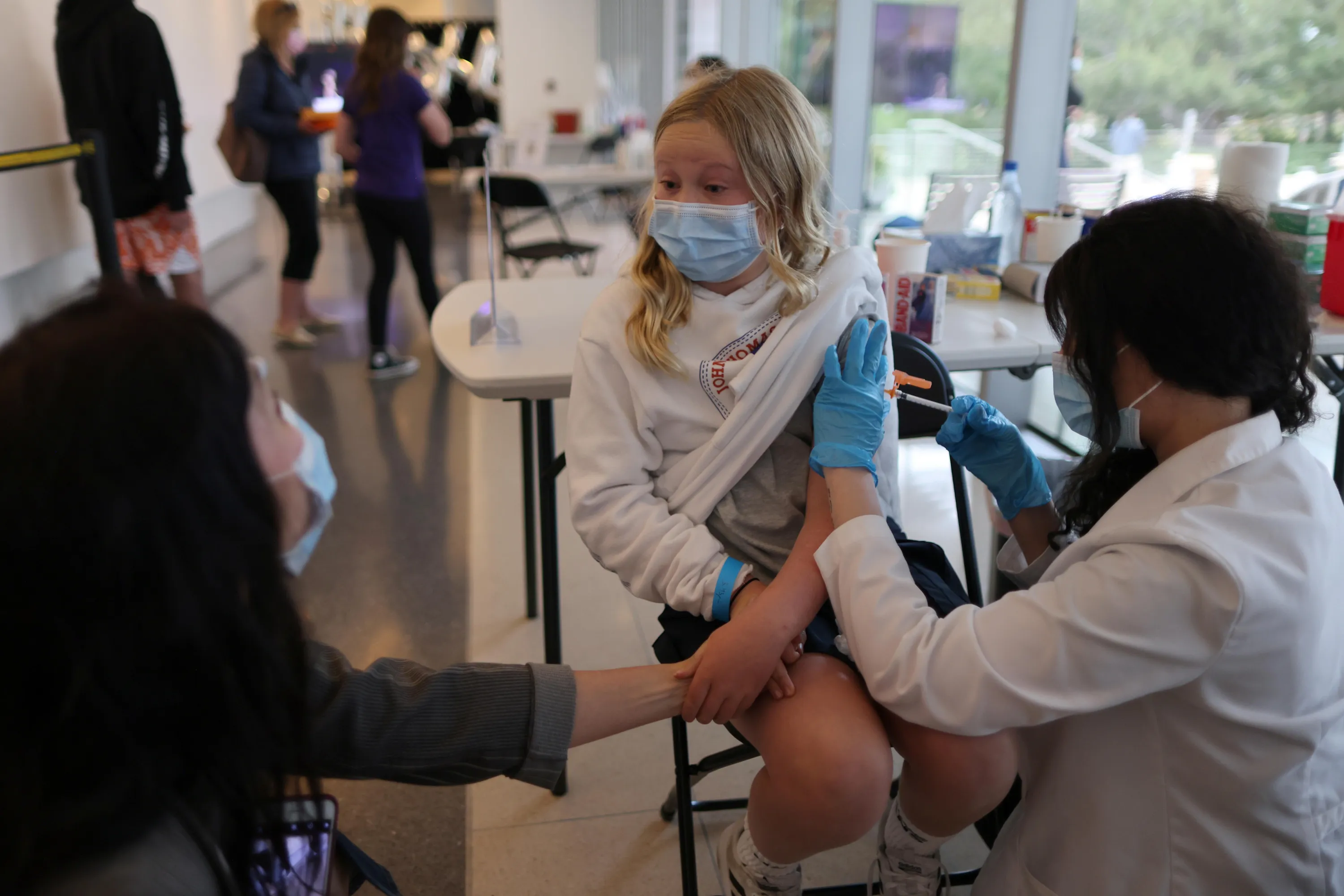 Kate Kleeman, 12, holds the hand of her mom, Hayley, as she receives a coronavirus disease (COVID-19) vaccination at a vaccine clinic for newly eligible 12 to 15-year-olds at the Annenberg Foundation in Los Angeles, California, U.S., May 13, 2021. (Photo by Lucy Nicholson/Reuters)