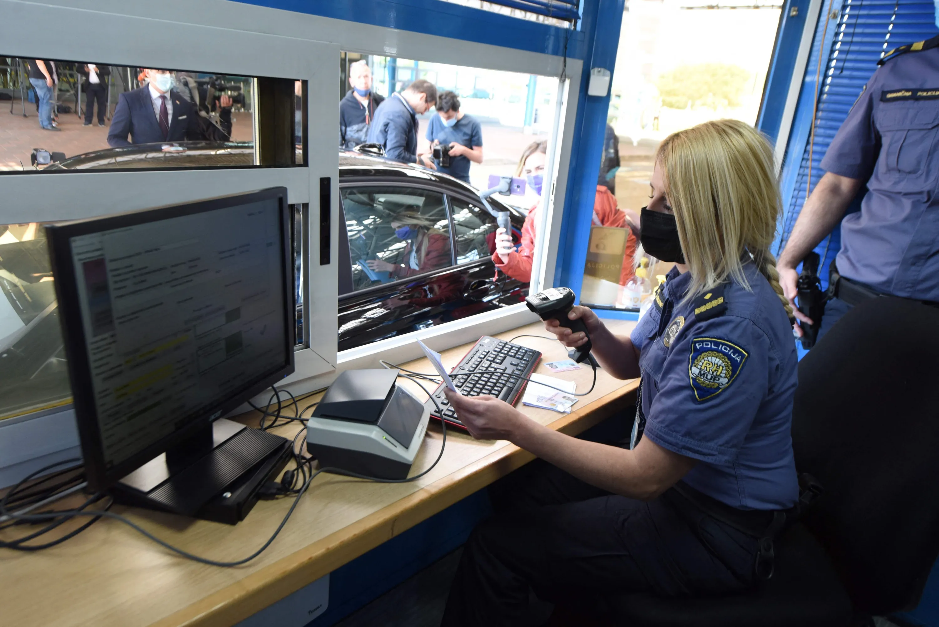 A policewoman at the Bregana border crossing between Croatia and Slovenia scans a EU's digital Covid passport on June 2, 2021. A passenger with a digital Covid passport proves that he received a vaccine against coronavirus (Covid-19). (Photo by Denis Lovrovic/AFP Photo)