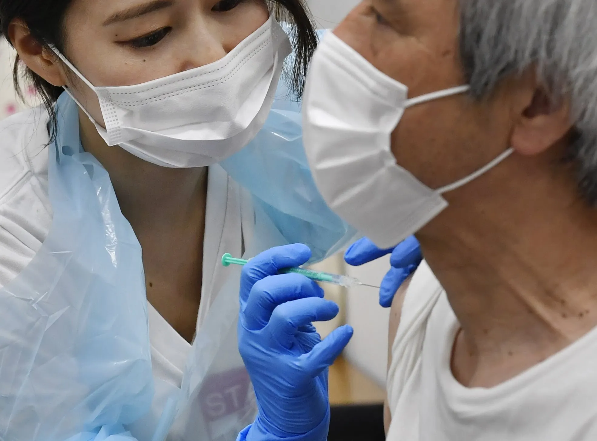 A man receives the Pfizer COVID-19 vaccine at the Noevir Stadium Kobe in Kobe, western Japan, Monday, May 31, 2021. The stadium is being used as an inoculation venue for local residents over 65 years old. Japan, seriously behind in coronavirus vaccination efforts, is scrambling to boost daily shots as the start of the Olympics in July closes in. (Photo by Yu Nakajima/Kyodo News via AP Photo)