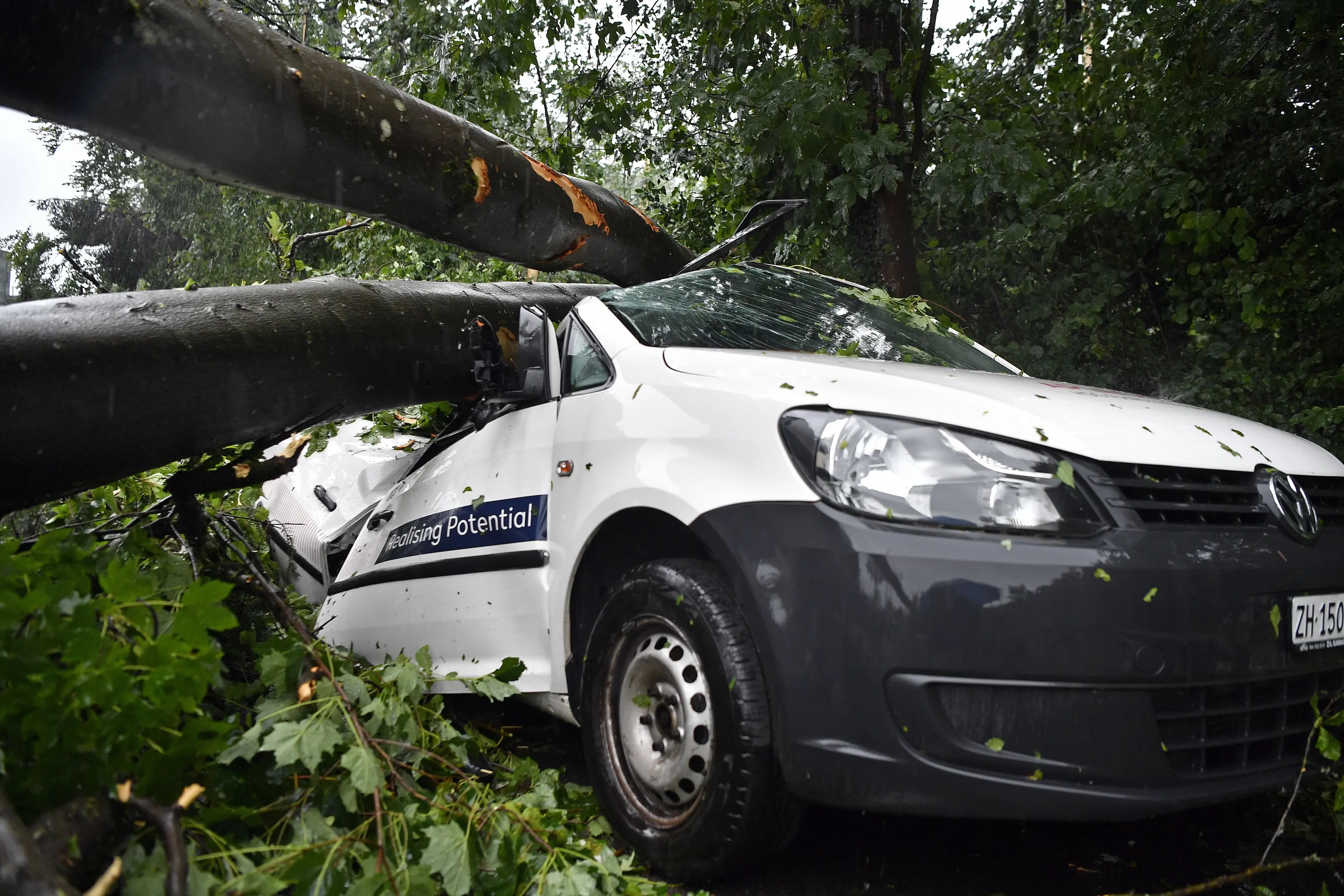 Fallen trees and broken branches hinder traffic and passage for pedestrians and cause numerous damages to buildings and cars after the heavy thunderstorm in Zurich, Switzerland, Tuesday, July 13, 2021. Violent thunderstorms with heavy rain, hailstorms and gale-force winds passed over Switzerland during the night on Tuesday. The Jura was affected first. Later, a thunderstorm over the canton of Zurich caused great damage. (Photo by Walter Bieri/Keystone via AP Photo)