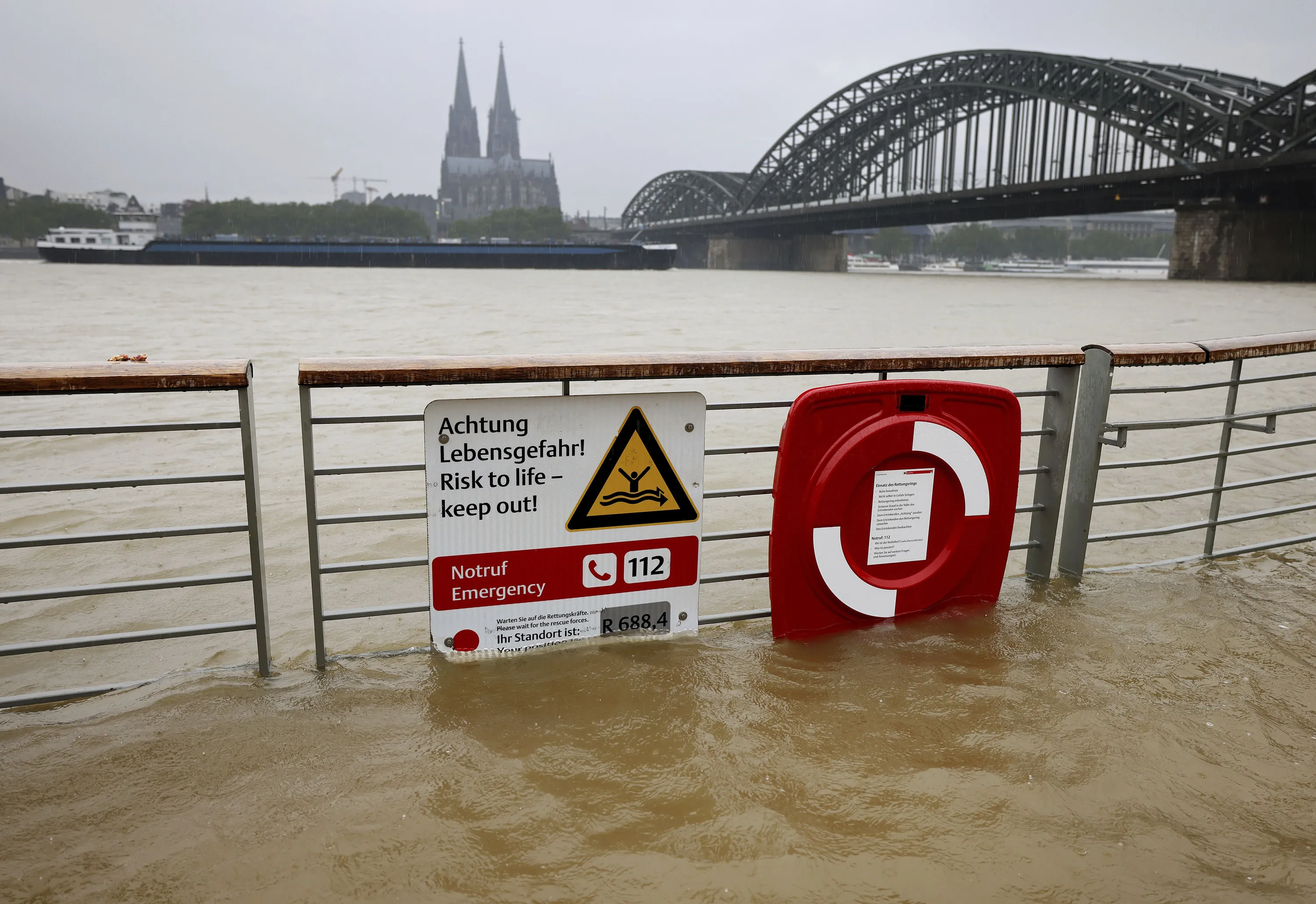The river Rhine floods the promenade in Cologne, Germany, Tuesday, July 13, 2021. Thunderstorms and lots of rain are expected in North Rhine-Westphalia over the next few days. (Photo by Oliver Berg/dpa via AP Photo)