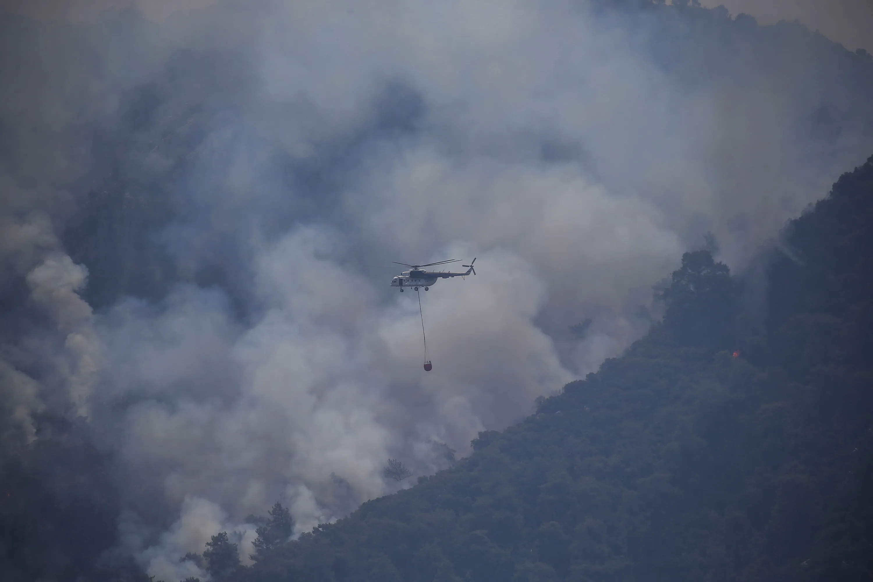 A firefighting helicopter flies over a wildfire that burns the forest in Turgut village, near tourist resort of Marmaris, Mugla, Turkey, Wednesday, August 4, 2021. (Photo by Emre Tazegul/AP Photo)