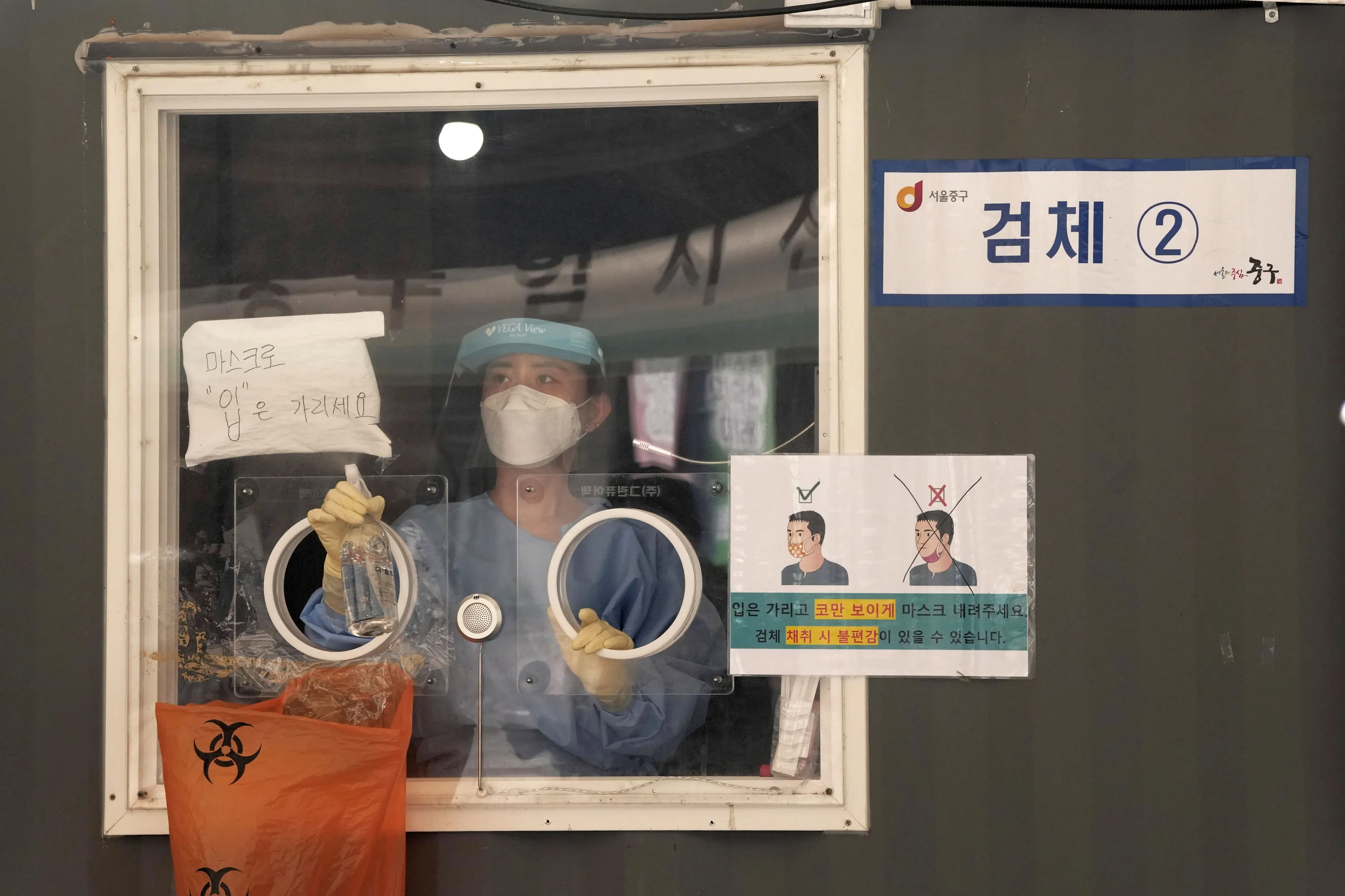 A medical worker in a coronavirus testing booth sprays disinfectant as she waits for people to come for tests in Seoul, South Korea, Wednesday, August 4, 2021. The sign at left reads “Please cover your mouth with a face mask”. (Photo by Ahn Young-joon/AP Photo)