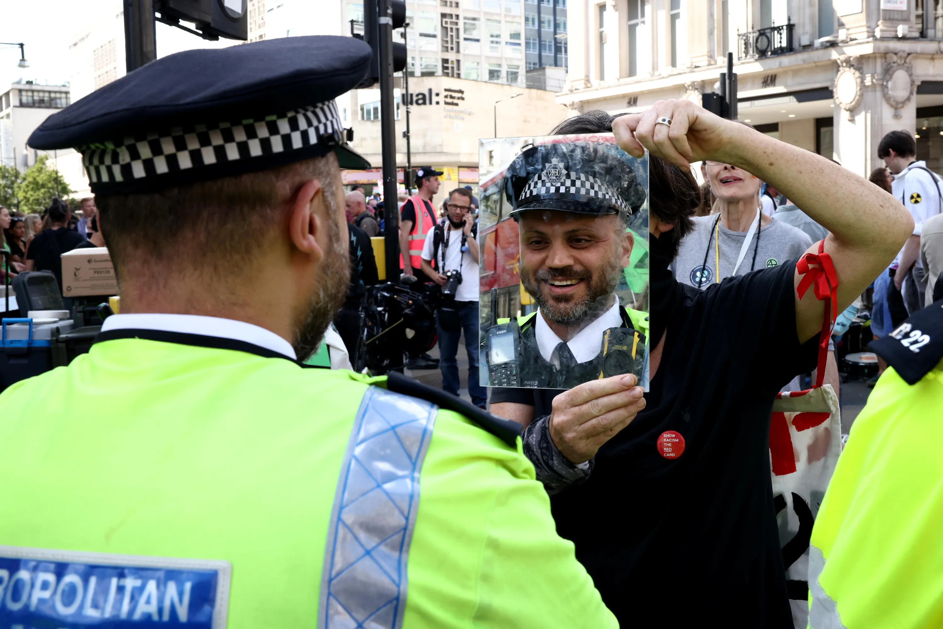 A demonstrator holds a mirror in front of a police officer during an Extinction Rebellion climate activists' protest, at Oxford Circus, in London, Britain on August 25, 2021. (Photo by Henry Nicholls/Reuters)