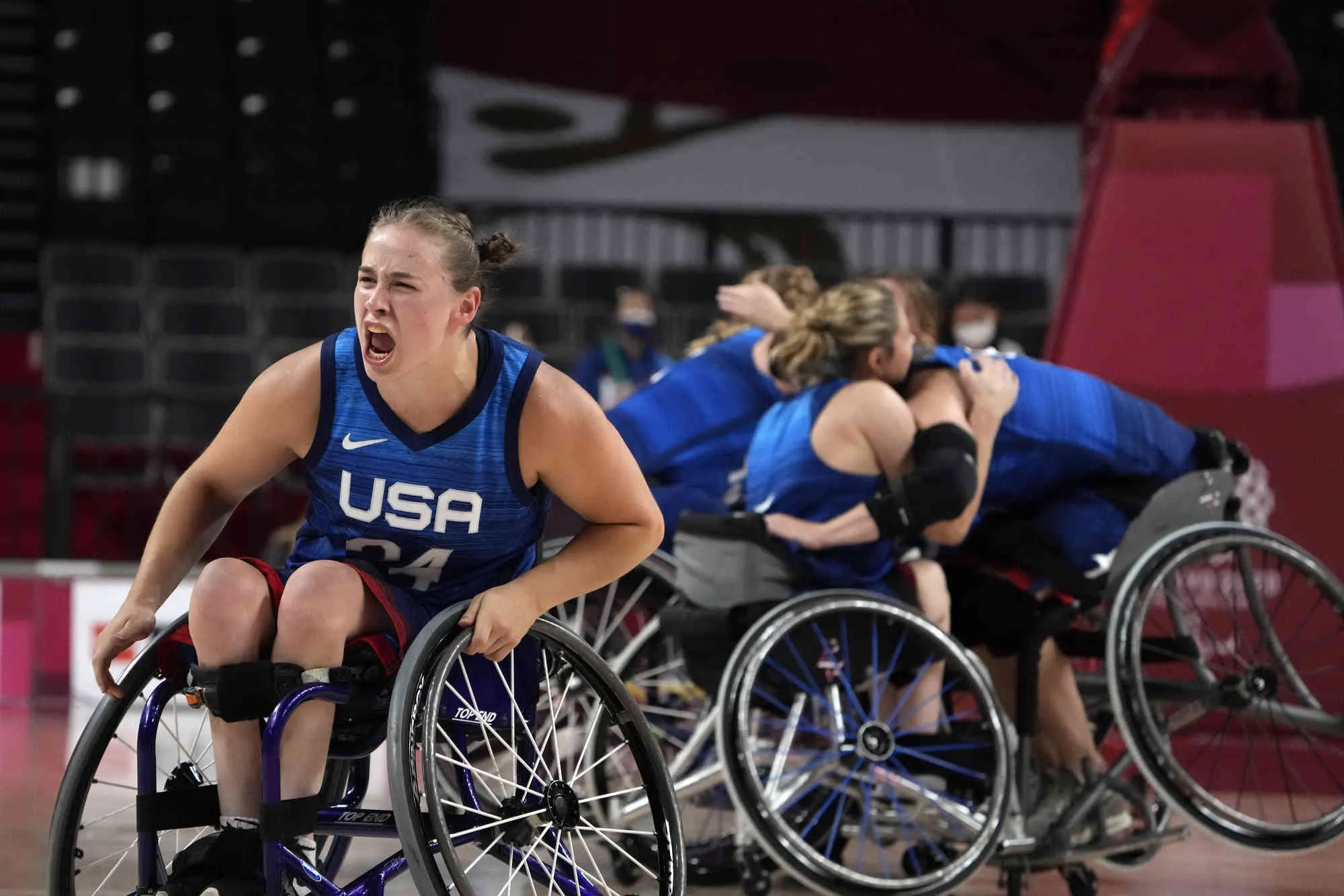 United States' Lindsey Zurbrugg, left, and her teammates celebrate as the United States defeated Canada in a women's wheelchair basketball quarterfinal game at the Tokyo 2020 Paralympic Games, Tuesday, August 31, 2021, in Tokyo, Japan. (Photo by Kiichiro Sato/AP Photo)