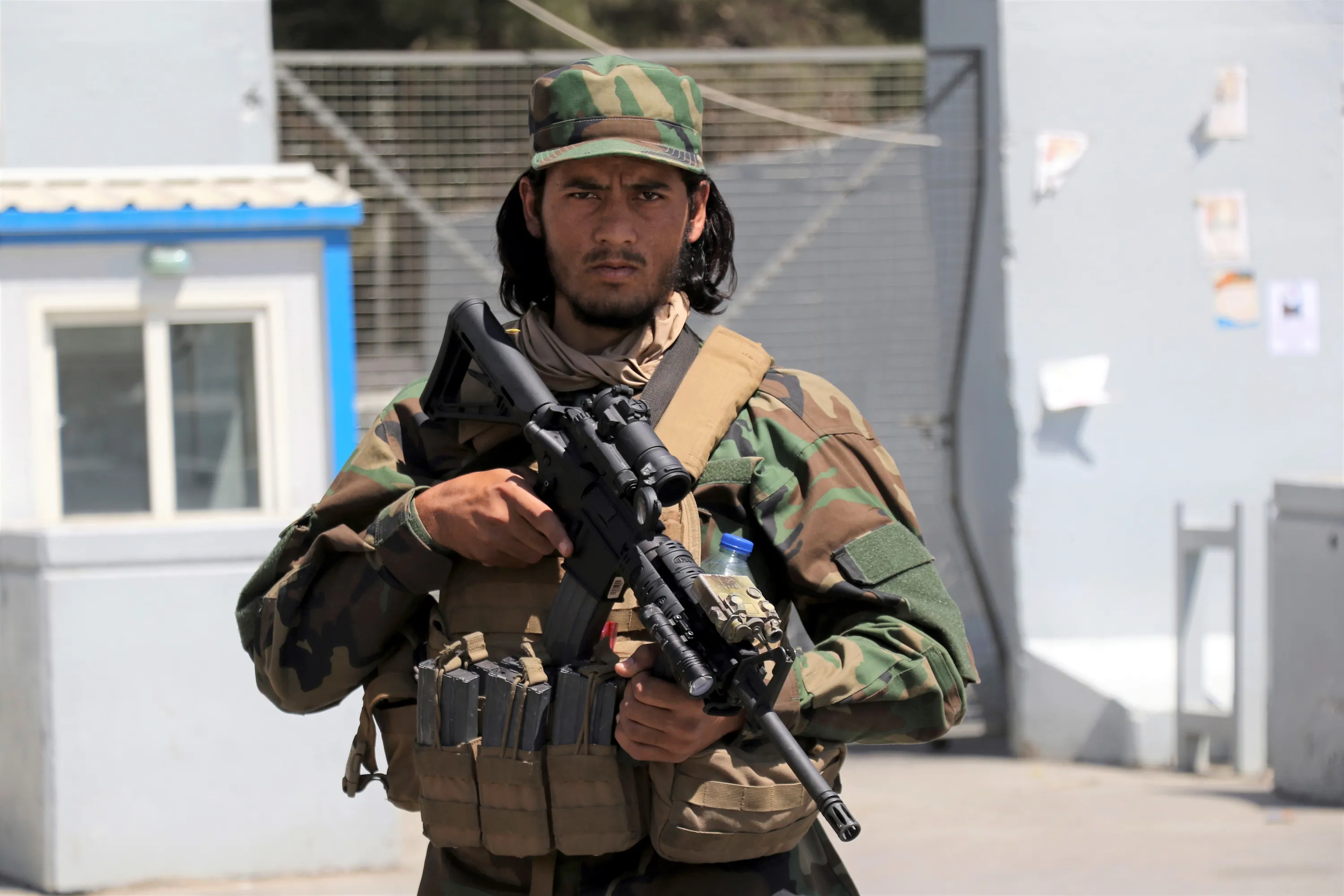 A Taliban soldier stands guard at the gate of Hamid Karzai International Airport in Kabul, Afghanistan, Sunday, September 5, 2021. Some domestic flights have resumed at Kabul's airport, with the state-run Ariana Afghan Airlines operating flights to three provinces. (Photo by Wali Sabawoon/AP Photo)